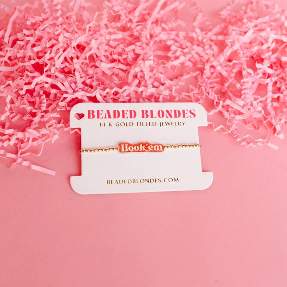 Introducing our signature 14K gold-filled beaded bracelet, meticulously crafted to capture the essence of your college pride. Each bead is custom-made, reflecting the unique spirit of your alma mater. Adorned with the rallying cry "Hook Em" this bracelet is more than just an accessory—it's a symbol of camaraderie, determination, and the unforgettable memories forged during your college journey. Whether worn on game days to show unwavering support for your team or as a daily reminder of your alma mater's influence, this bracelet is a timeless tribute to the bonds formed and the triumphs celebrated. Embrace your collegiate pride and elevate your style with this exquisite piece that transcends fashion to embody the essence of your alma mater's spirit.