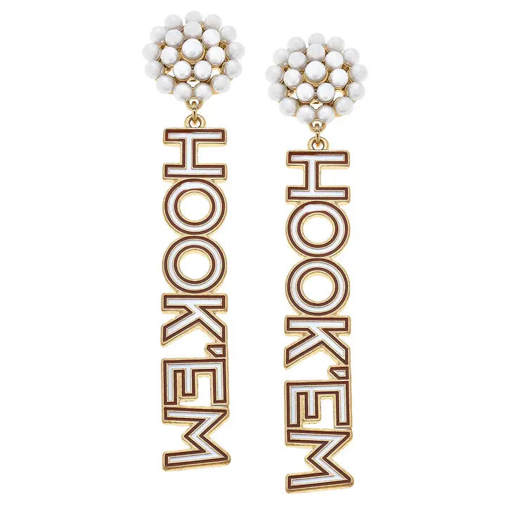 Accessorize your game day look with these University of Texas drop earrings. The “Hook 'Em” earrings are perfect for making a statement while showing off your team spirit with pearl embellishments and block letters!