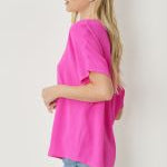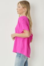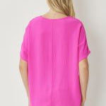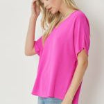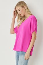 Solid v-neck top featuring asymmetric rounded hem detail. Unlined. Semi-sheer. Woven. Lightweight