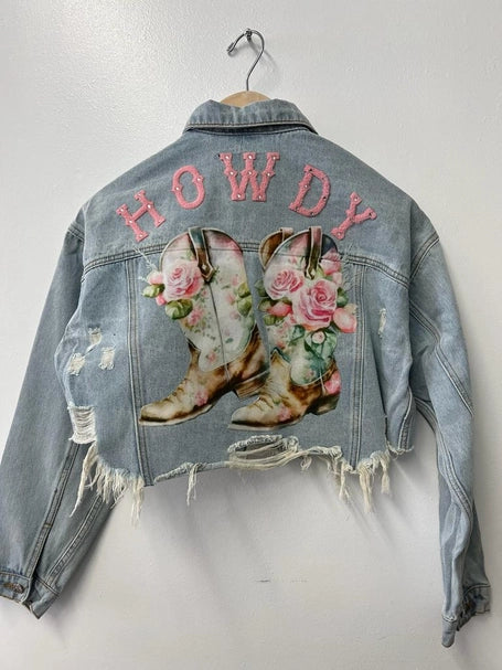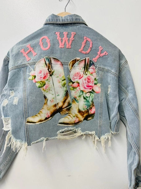This cropped denim jacket is the perfect finishing touch for your Rodeo outfit this year! This jacket features a distressed finish making for a stylish and playful piece. Adding a touch of western flair, the back of the jacket showcases the word "Howdy" in vibrant pink lettering. Beneath the lettering, a charming floral design and boots illustration enhance the overall aesthetic!