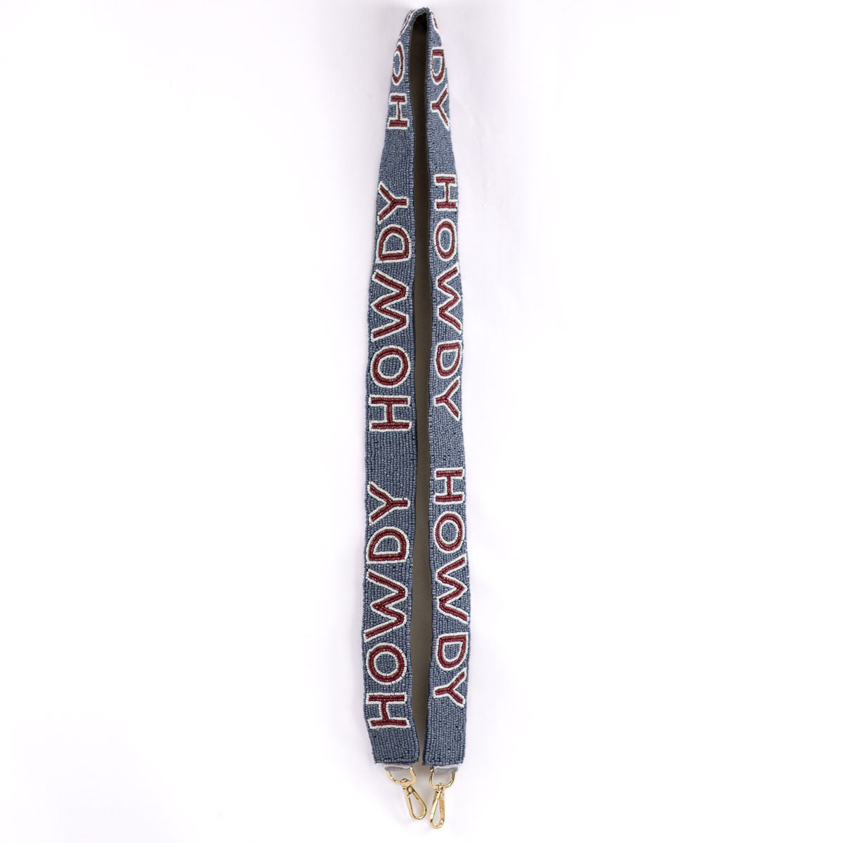 This purse strap is a must have on game days! All eyes on you in College Station! Show your gameday spirit with our chic Howdy Beaded Purse Strap! The red beading of the words stands out against the grey background, sure to be a eye-catching accessory!