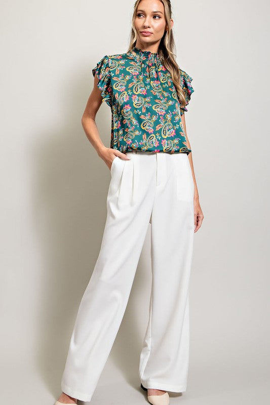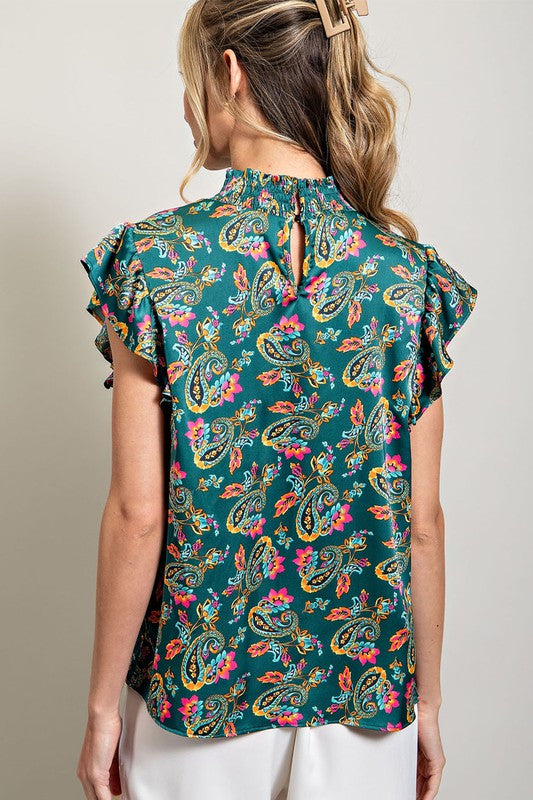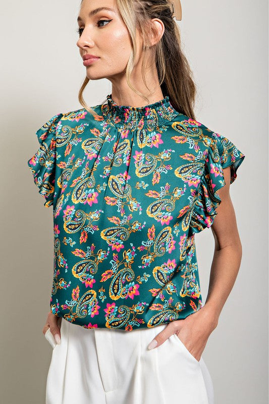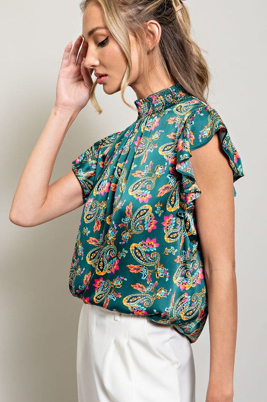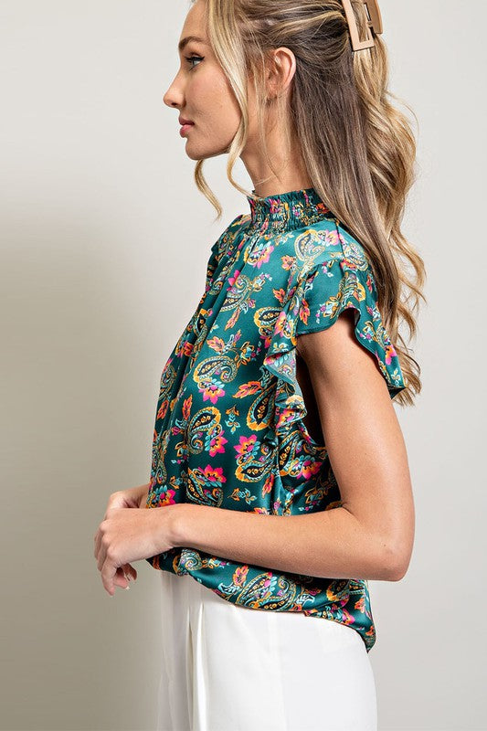 Paisley printed satin top featuring a smocked mock neck, ruffled sleeves, keyhole and button closure for added comfort, and slight pinching for added detail.