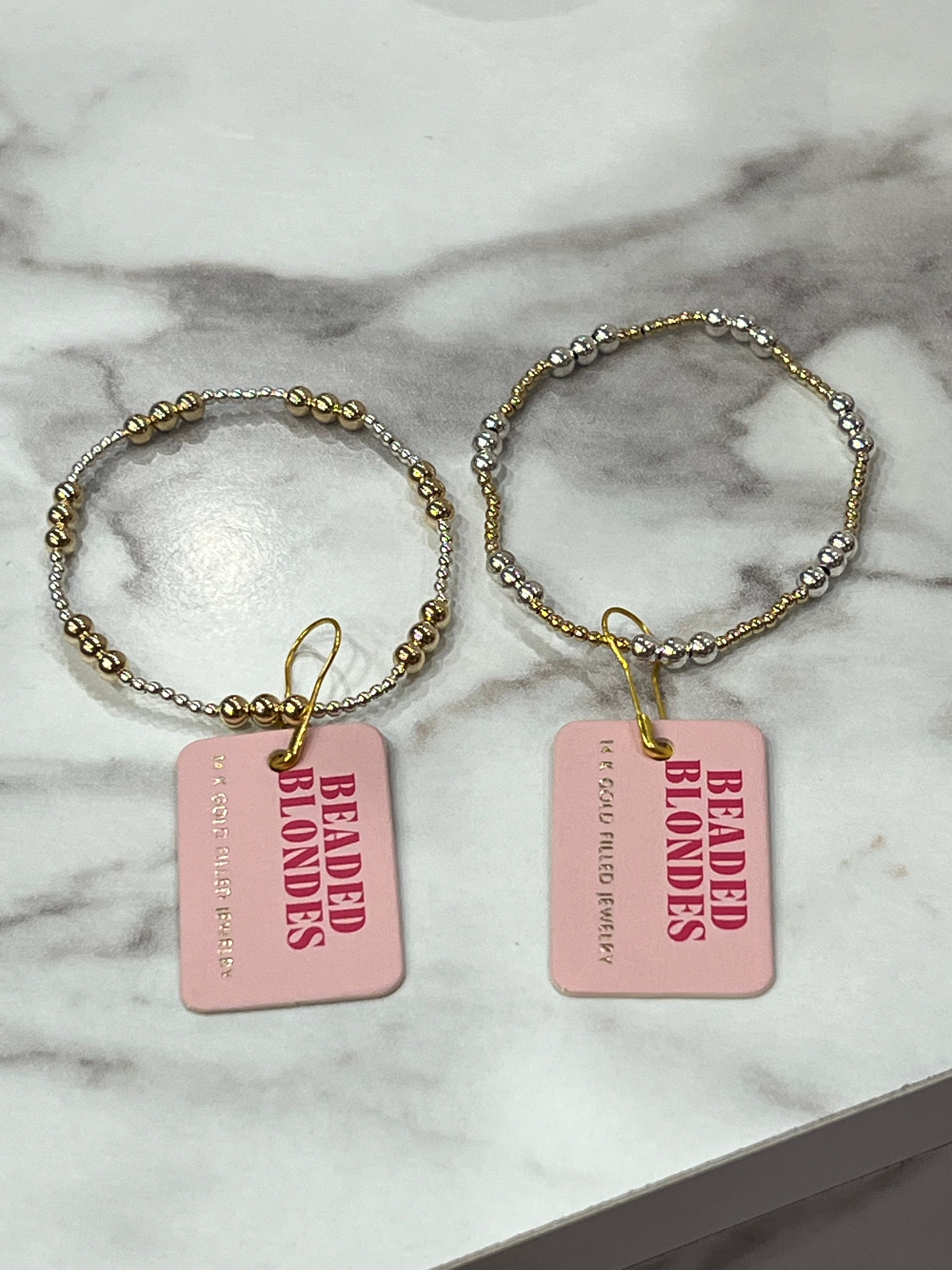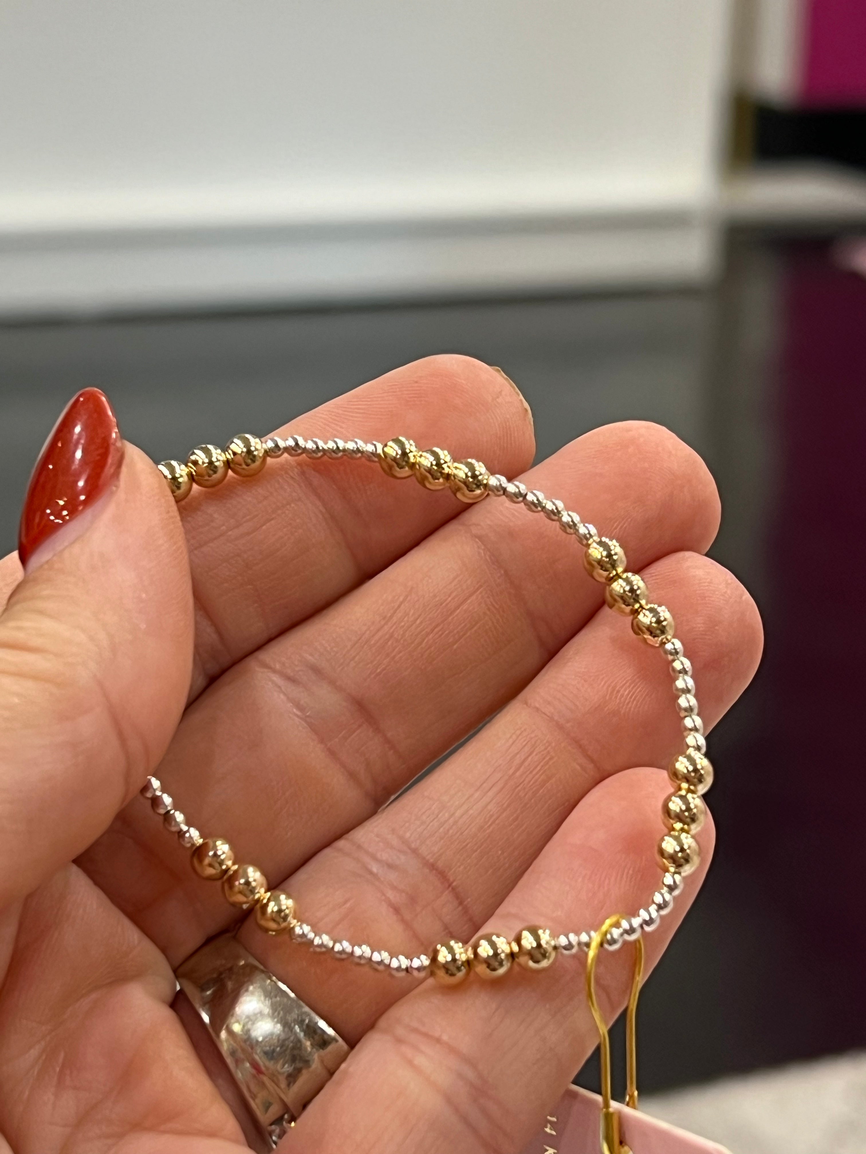 This best seller just got better with the mix of gold and silver beads! Tell someone you love them with our ILY (I love you) bracelets. This is a mix of 2mm & 4mm 14 K gold filled beads. There are 3 beads to symbolize I love you. For the brides- this can symbolize tying the knot between you, your significant other and God. Material: 14 K gold filled beads and durable elastic string so perfect for everyday wear! Sweat proof, water proof and tarnish free!
