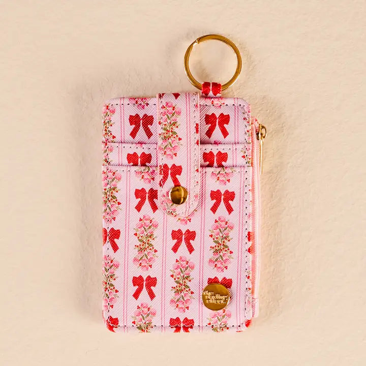 Greet the season with our stylish keychain wallet, the perfect accessory to match your wristlets or belt bags! Clip it on and go hands-free with all your cards. This is the perfect stocking stuffer for those who prefer to keep their wallets light and clutter-free! Zippered closure and key ring 4 card slots and zippered coin holder Dimensions: 4.5” X 3” X 0.25”