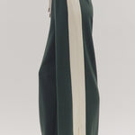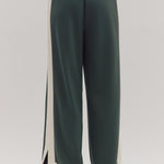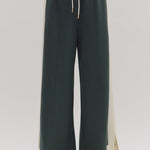 Solid wide leg knit pants featuring elastic waistband with drawstring. Contrast stripe detail at sides with slit hem. Side pockets. Unlined. Knit. Non-sheer. Lightweight