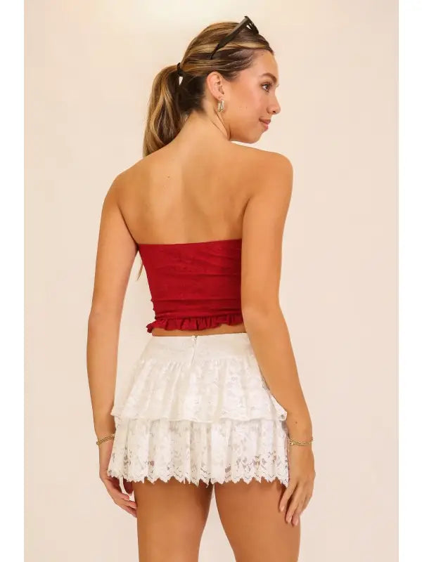 Effortlessly feminine and light as a breeze, this white lace mini skort  features layered lace with a flouncy, romantic hem. A comfortable interior lining and a soft, breathable feel make it perfect for warm days, date nights, festivals, or sunny weekends. Pair with a cropped top for a chic, stylish look.