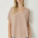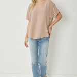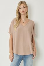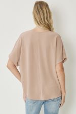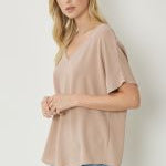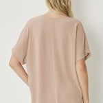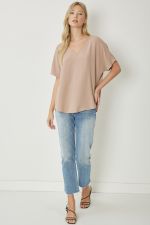 Solid v-neck top featuring asymmetric rounded hem detail. Unlined. Semi-sheer. Woven. Lightweight.