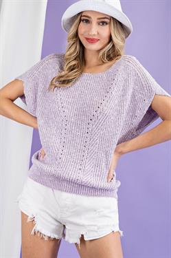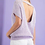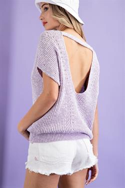 Short sleeve sweater top detailed with a pointelle design and open back.