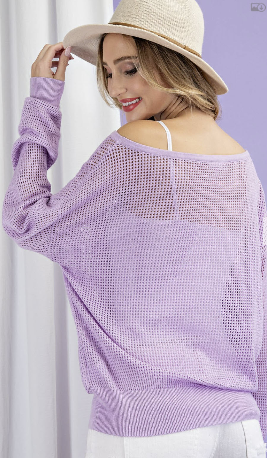 A pointelle knit sweater with ribbed cuff sleeves. Perfect for a light cover up.