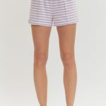 Striped knit shorts featuring elasticated drawstring waist and side pockets. Unlined. Knit. Non-sheer. Lightweight.