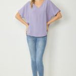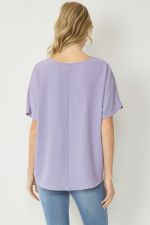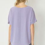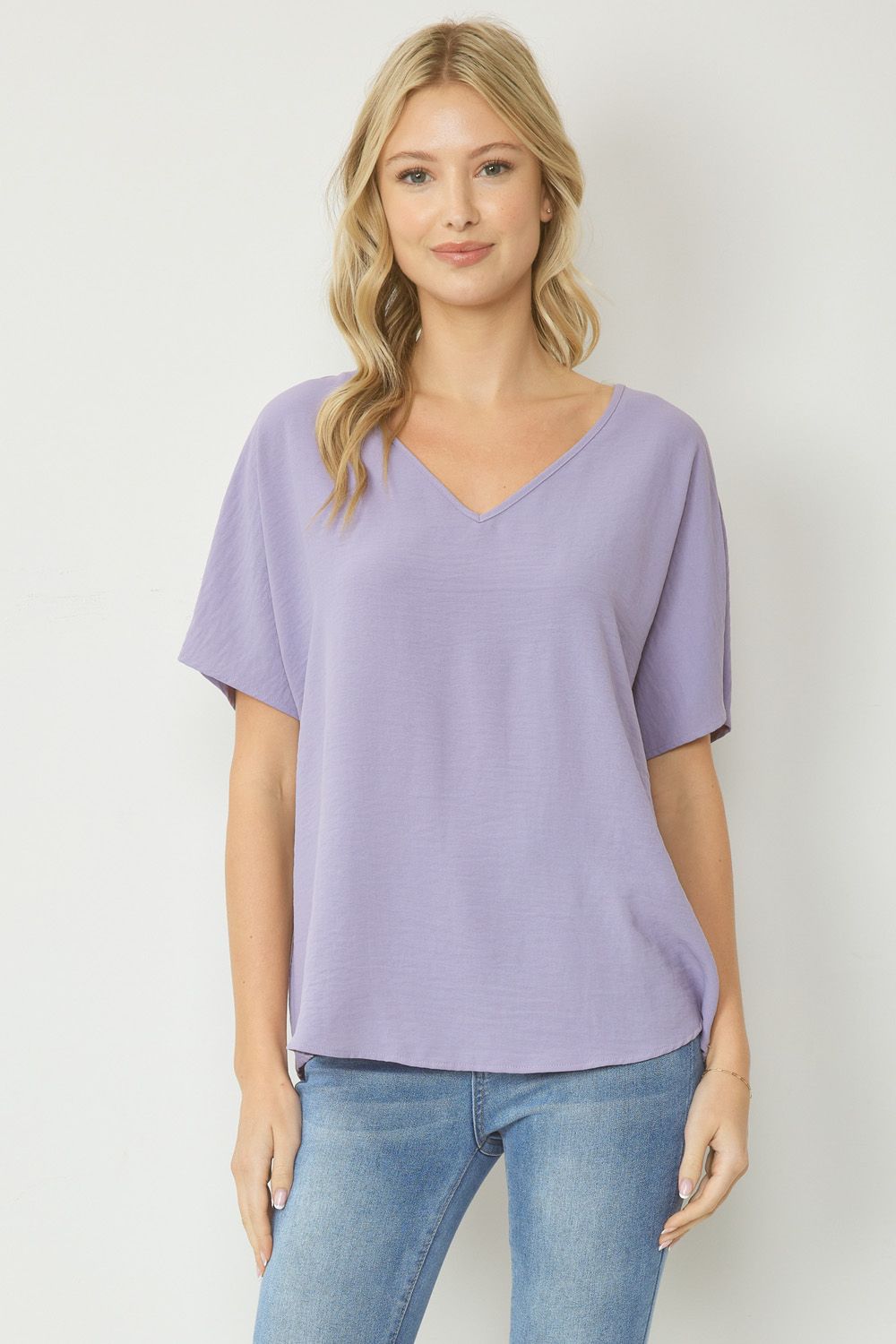 Solid v-neck top featuring asymmetric rounded hem detail. Unlined. Semi-sheer. Woven. Lightweight.