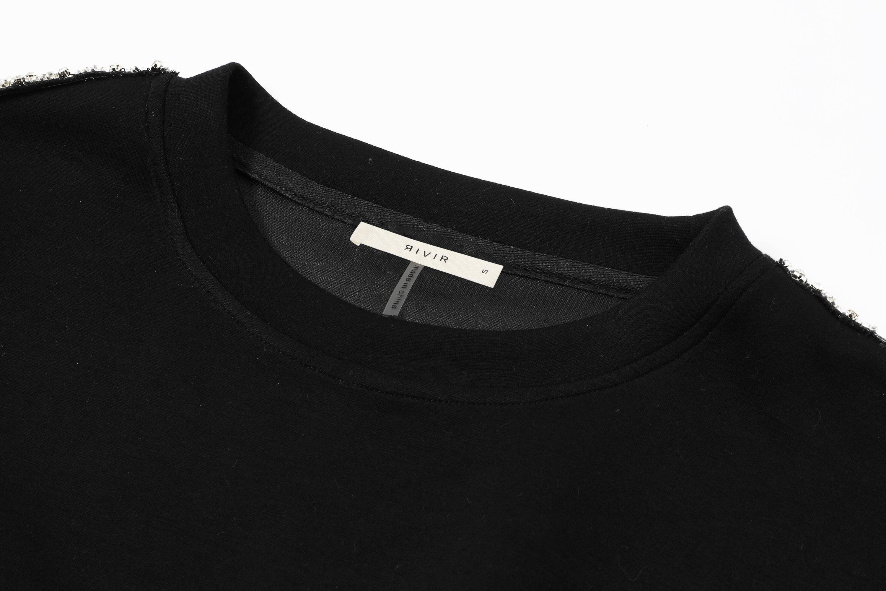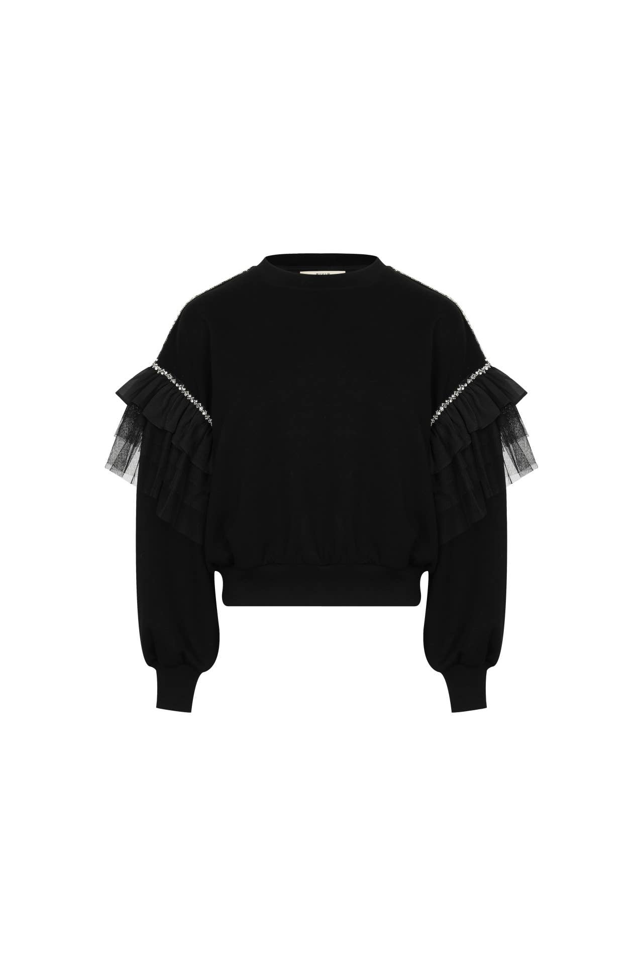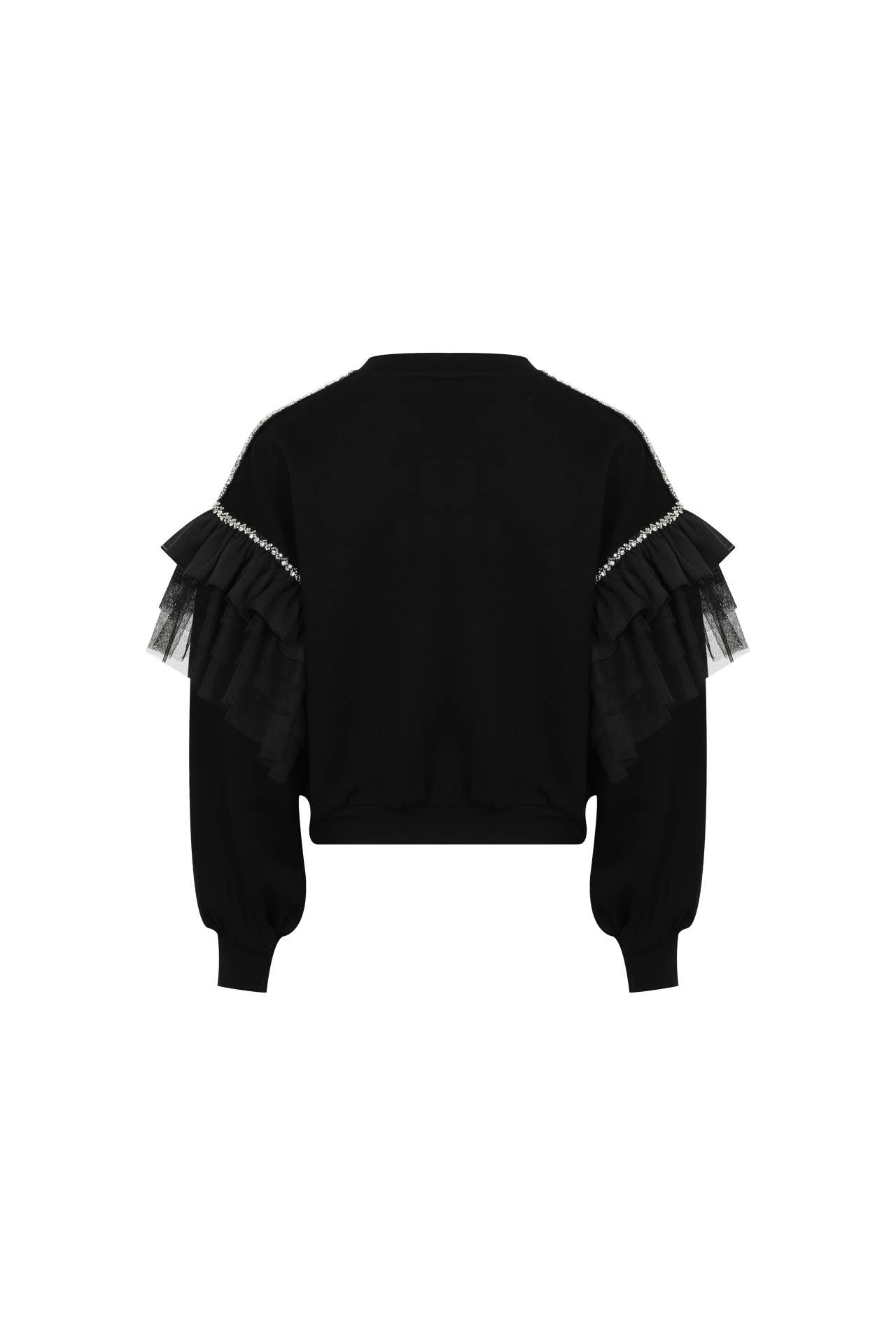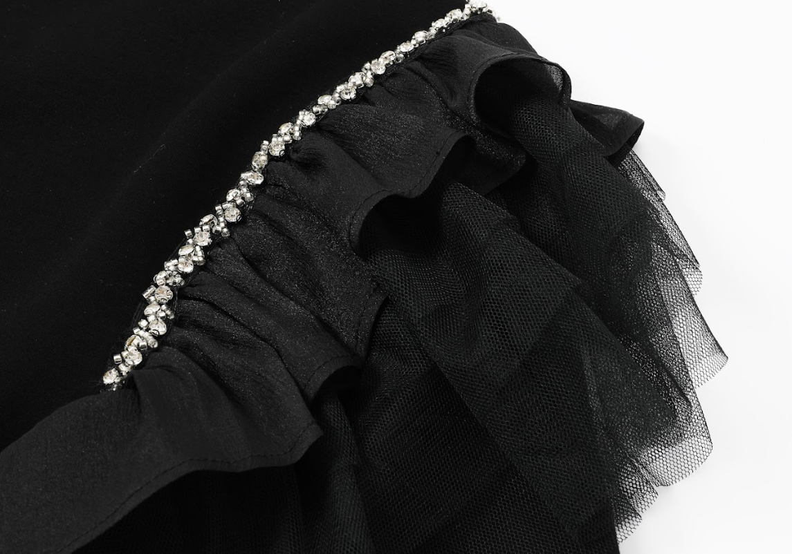Elevate your wardrobe with this stunning black sweater designed to make every outfit shine. Featuring rhinestone-embellished shoulders and soft tulle accents along the upper sleeves, this piece blends elegance with a touch of drama—creating a look that’s effortlessly chic.