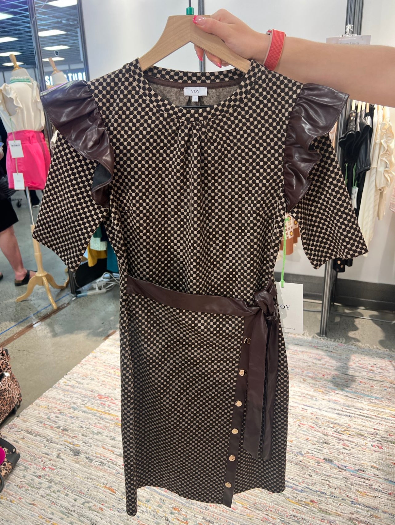 Leather detailed wrap dress in brown with side tie.