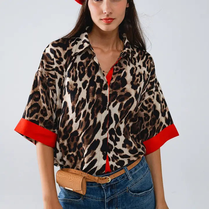 This Leopard Short Sleeves Shirt is the perfect mix of bold and stylish. The classic leopard print adds an edgy, wild touch, while the red button placket and matching red sleeves give it a fun, pop of color. The short sleeves keep it breezy and comfortable, making it ideal for warmer days or layering under a jacket. Whether you’re keeping it casual with jeans or dressing it up, this shirt adds a playful, yet chic element to any outfit. It’s the kind of top that effortlessly turns heads while keeping things cool and comfortable.