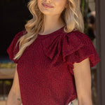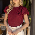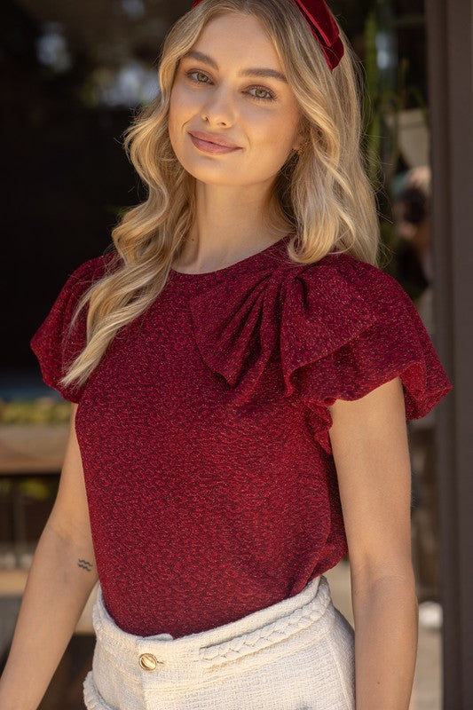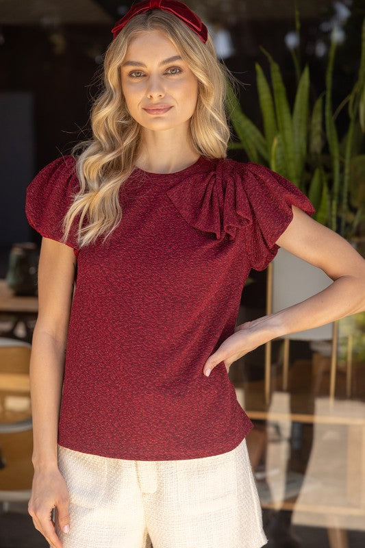 This chic leopard textured knit top is a wardrobe essential that effortlessly combines style and comfort! The round neckline offers a classic look, while the short sleeves keep it light and breezy for warm days or layering under a jacket. The adorable shoulder ribbon detail adds a playful twist that elevates the whole vibe. Plus, the back neck button and elastic loop closure make it easy to slip on and off. Whether you pair it with jeans for a casual day out or dress it up with a skirt for a night out, this top is sure to become a go-to favorite that brings a touch of wild flair to your outfits!