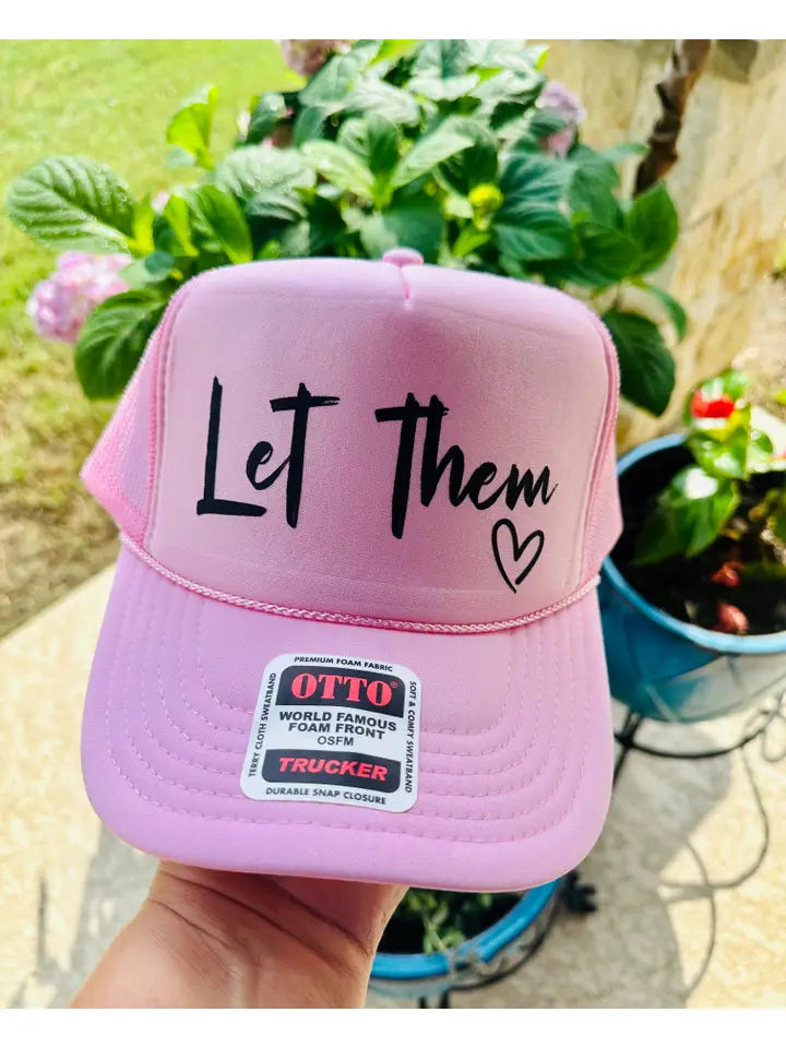 "Let Them" design direct-to-film printed on a Light Pink Otto brand foam trucker hat. The perfect accessory to make a bold statement!