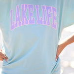 Introducing the epitome of summertime charm: a bright baby blue tee featuring a delightful "Lake Life" print that captures the essence of leisurely days by the water! The print showcases lively purple wording boarded in soft baby pink!