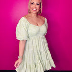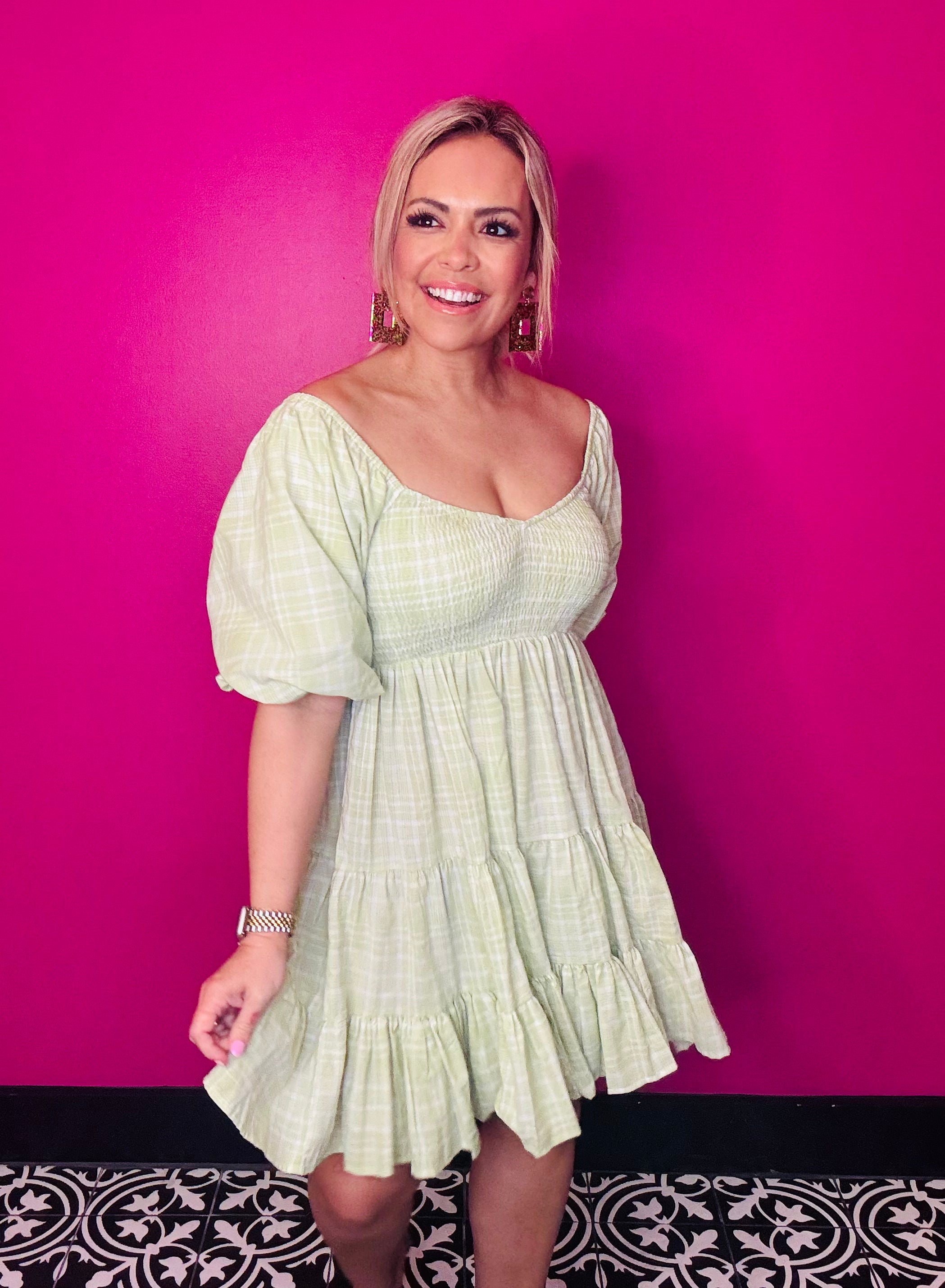 This lime green plaid puff sleeve mini dress is a bold and fun statement piece that’s all about playful style. The bright lime green color gives it an energetic vibe, while the classic plaid pattern keeps it grounded and trendy. The puff sleeves add a cute, romantic touch, giving the dress a fun, feminine silhouette. Perfect for when you want to stand out and feel effortlessly cool, whether you're hanging out with friends or hitting a casual event. It’s that dress that’s bold enough to catch attention but still feels relaxed and comfy!