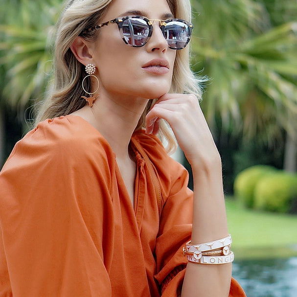 Our Enamel Claudia Bangle is the perfect accessory for Texas Longhorns fans everywhere! A classic worn gold bangle with enamel logo charms attached, wear it alone or stack it with the Enamel Hinge Bangles to make a stack statement.