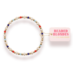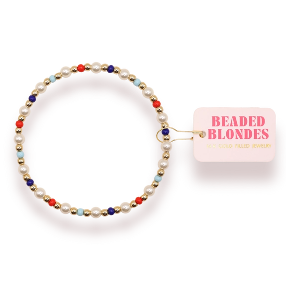 This bracelet is perfect for Memorial Day or 4th of July. A custom made bead with festive combination of blue and white. Comes in a variety of sizes! Material: 14 K gold filled beads, Swarovski Synthetic glass pearls and durable elastic string. Hand strung with love in College Station, Texas. View our sizing guide Beaded Blondes offers styles with both freshwater and synthetic pearls—this design features synthetic pearls for a perfectly symmetrical, uniform look.