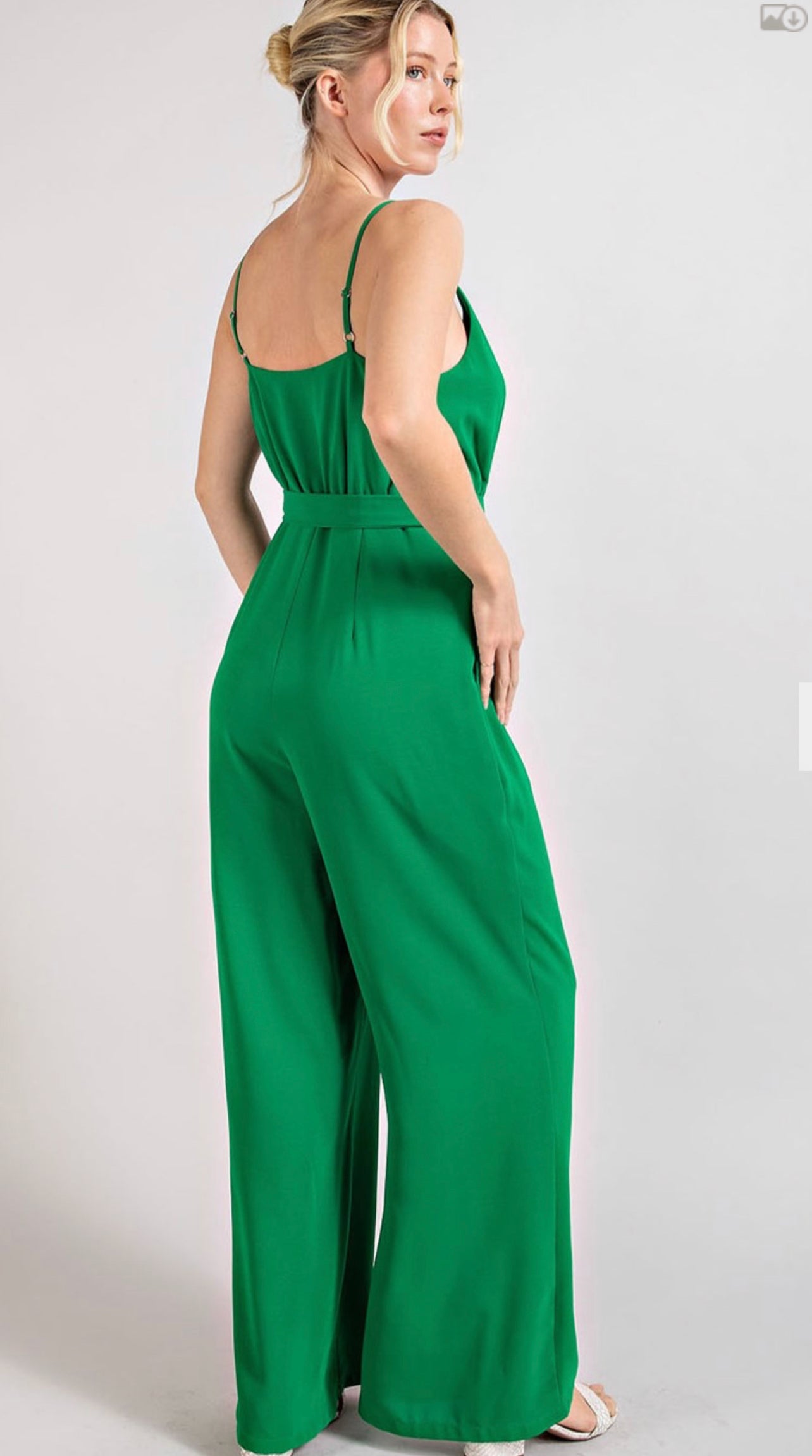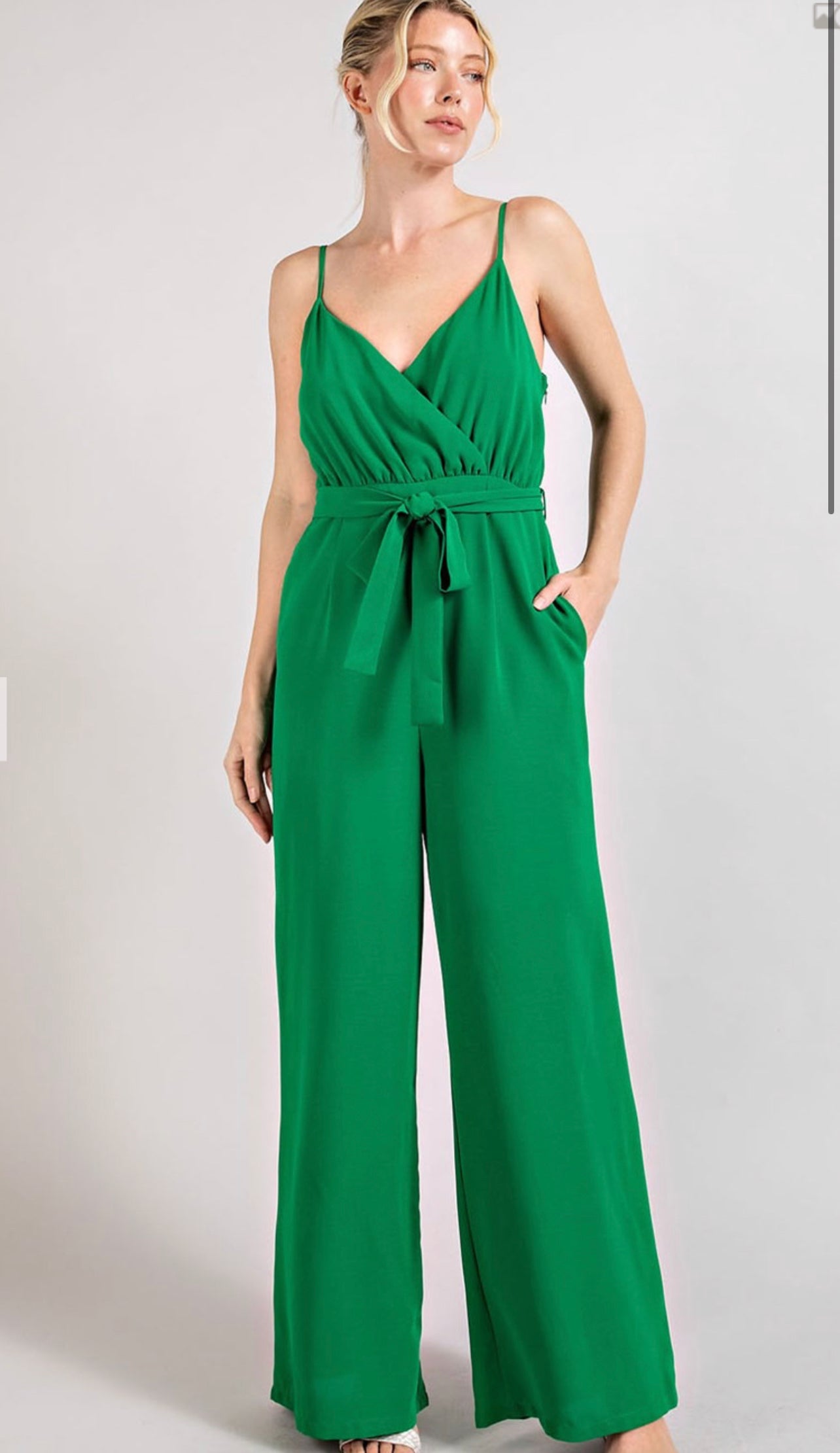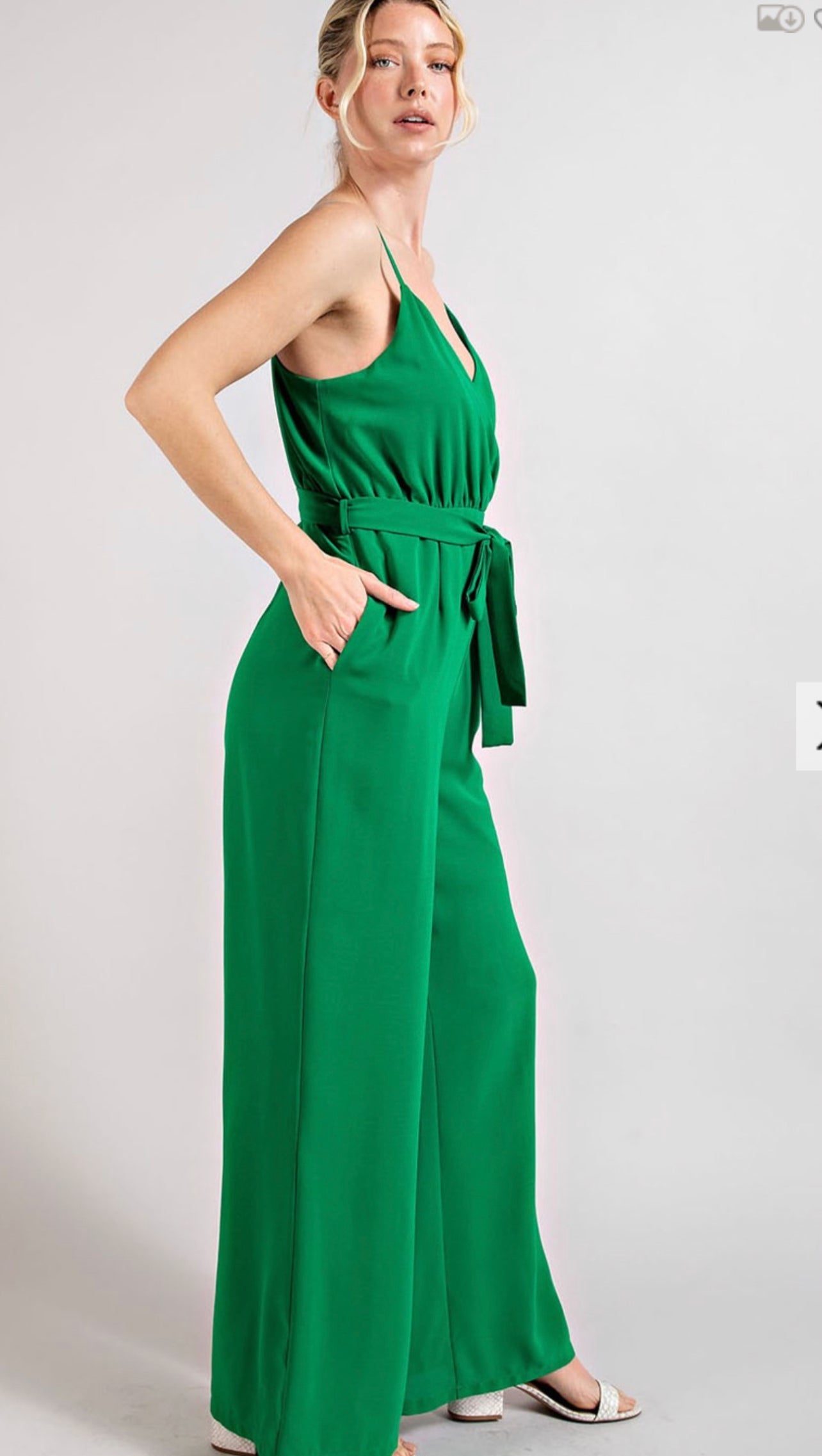 Sleeveless v-neck jumpsuit featuring a waist tie, adjustable straps, and pockets.