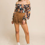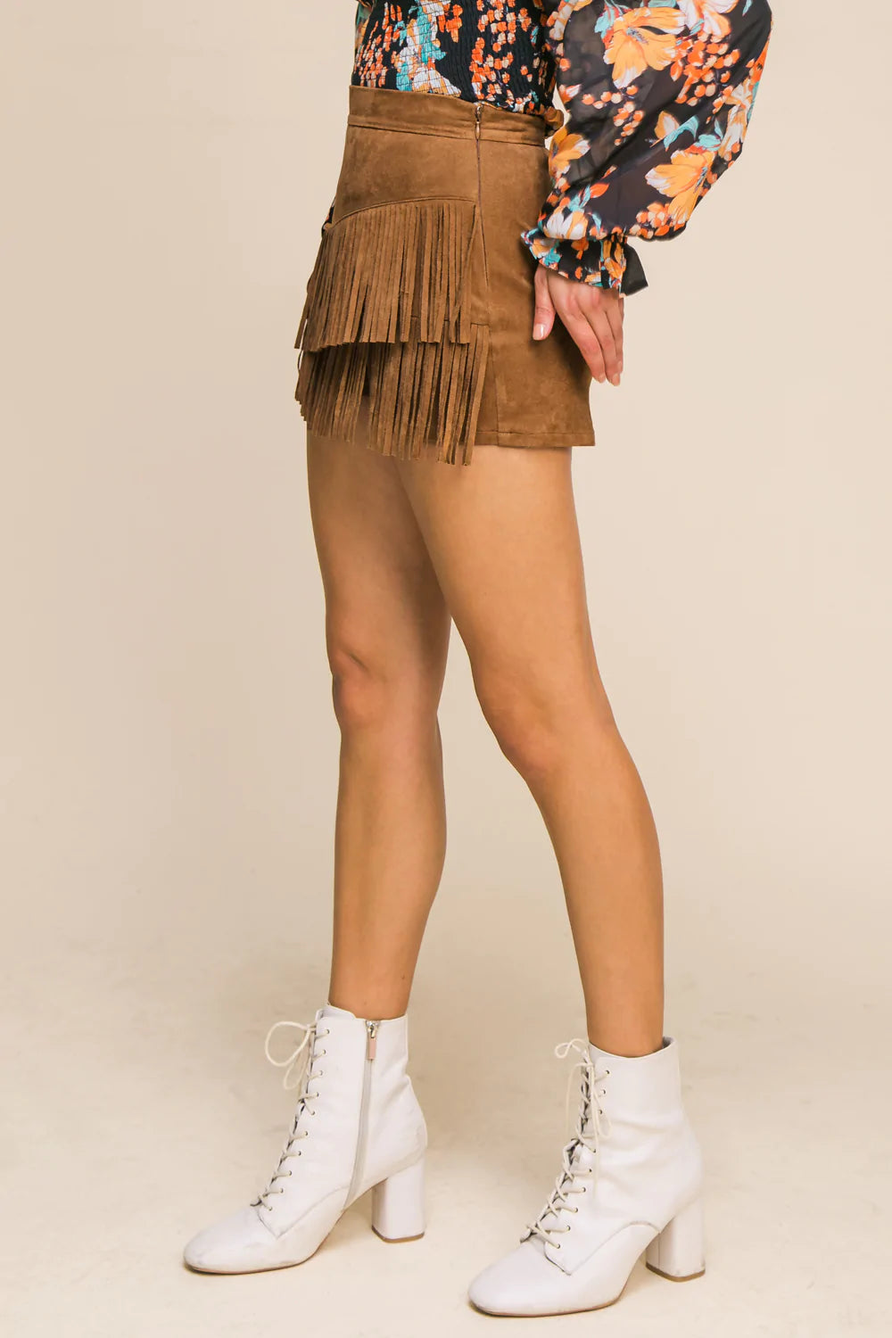 A faux suede skort featuring double fringed bottom with side zipper closure
