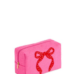 Measures L 9.5" x W 4" x H 6"Made from cotton, polyester, and faux pearls, Go big and bow home with the Mara Bow Large Zip Pouch. Wrapped in a vibrant pink woven texture and topped with a playful red polka dot bow, this pouch is a standout accessory for stashing all your must-haves. The roomy interior makes it perfect for makeup, hair essentials, or your on-the-go glam routine. Finished with a top zip closure, it’s cute, colorful, and totally functional.