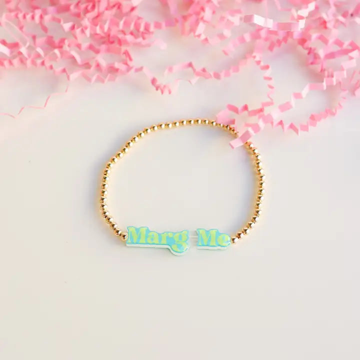 Imagine a luxurious 14K gold-filled beaded bracelet, meticulously crafted to radiate elegance and charm. This bracelet features delicate gold beads that shimmer with every movement, lending a touch of sophistication to its design. Among the gold beads are two distinct acrylic beads, in a vibrant shade of green and outlined in a beautiful shade of blue. Each acrylic bead is adorned with bold, block letters that spell out "marg me," creating a playful and personalized statement.