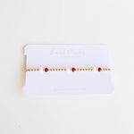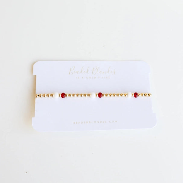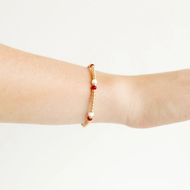 Add a pop of color or show your team spirit with this Maroon & White Game Day Bracelet! This fan-favorite fashion piece is the perfect accessory for any sports game. Go team! Material: 14 K gold filled beads, letter beads, Czech glass beads and durable elastic string. Hand strung with love in College Station, Texas.