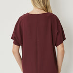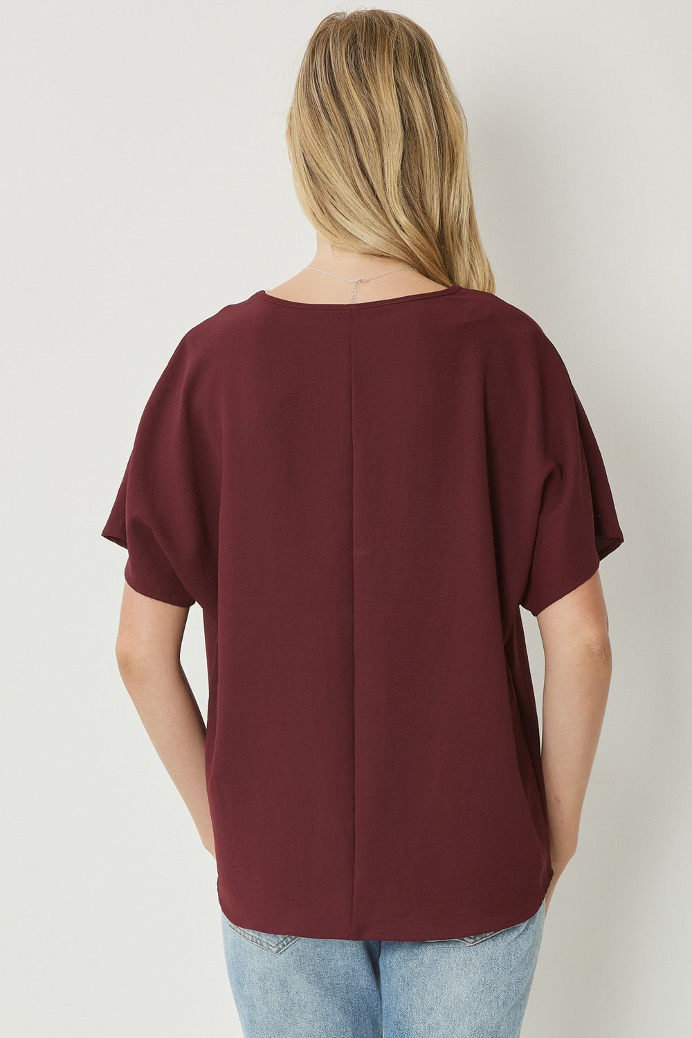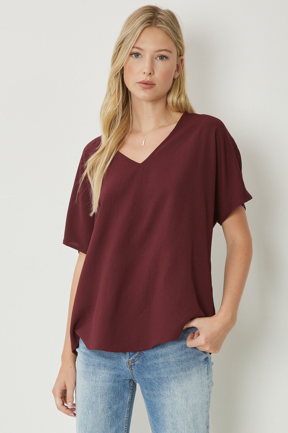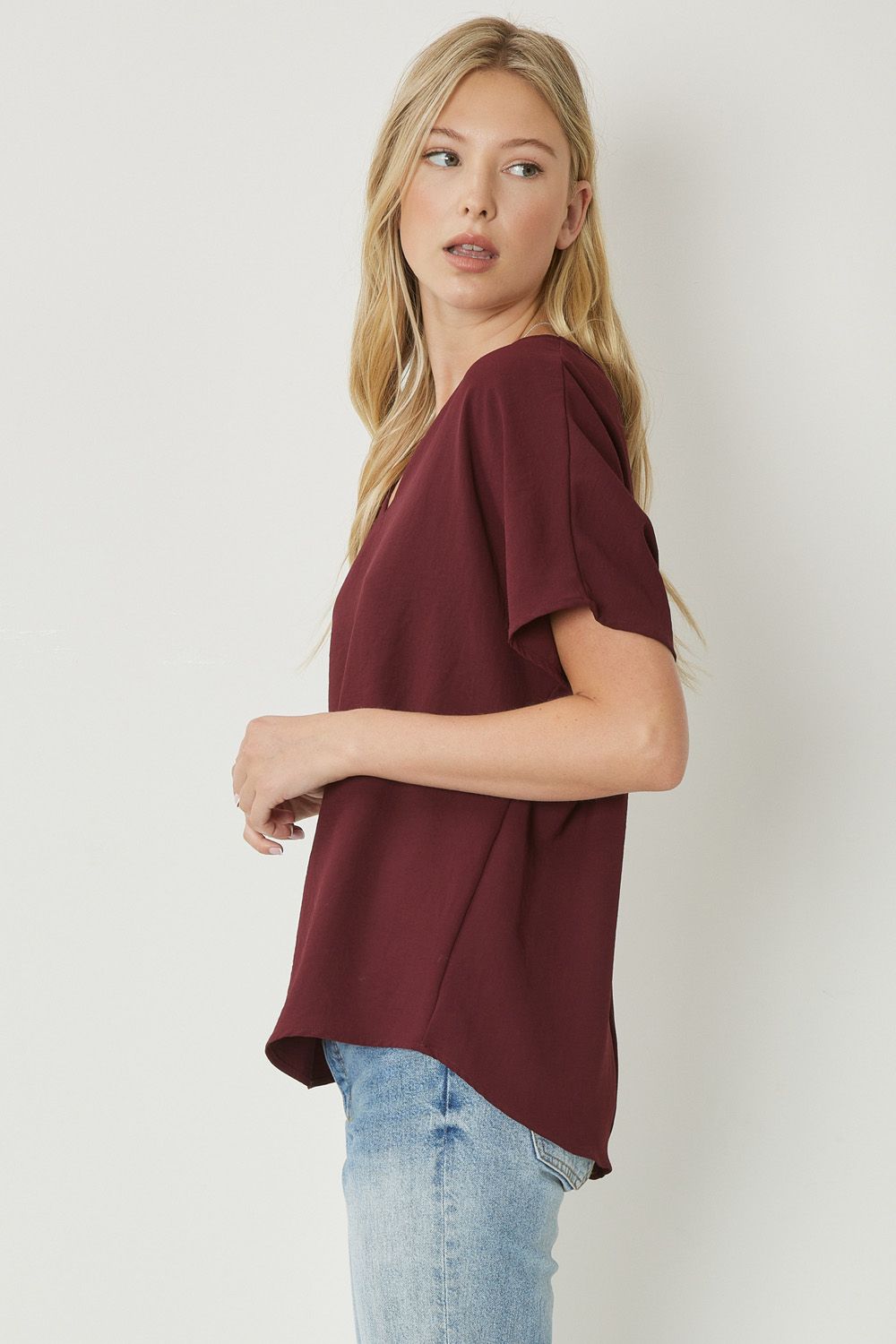 Solid v-neck top featuring asymmetric rounded hem detail. Unlined. Semi-sheer. Woven. Lightweight.