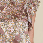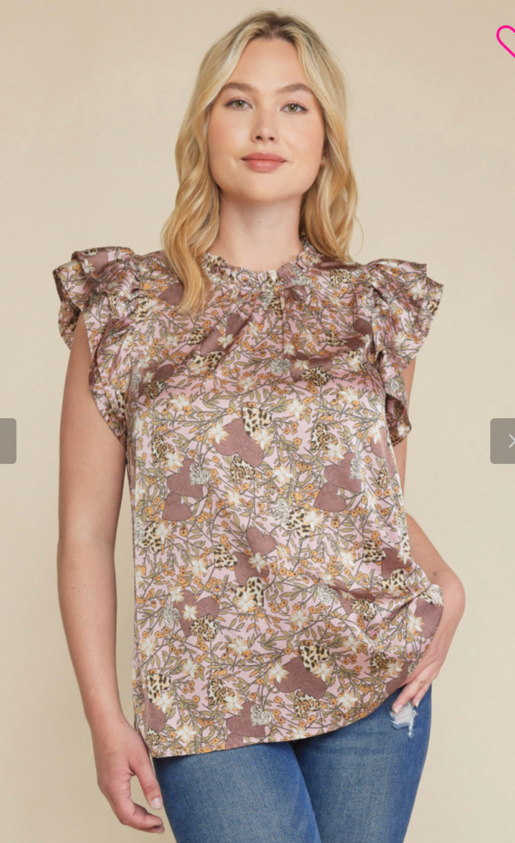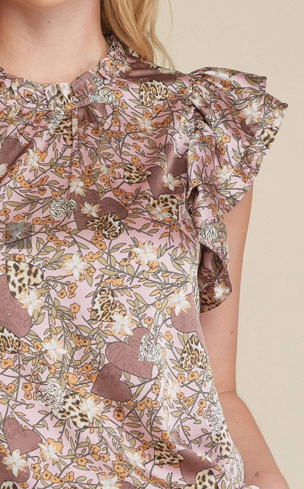 Satin print mock neck sleeveless top featuring ruffled neckline and shoulders. Keyhole button closure at back neck. Unlined. Woven. Non-sheer. Lightweight.