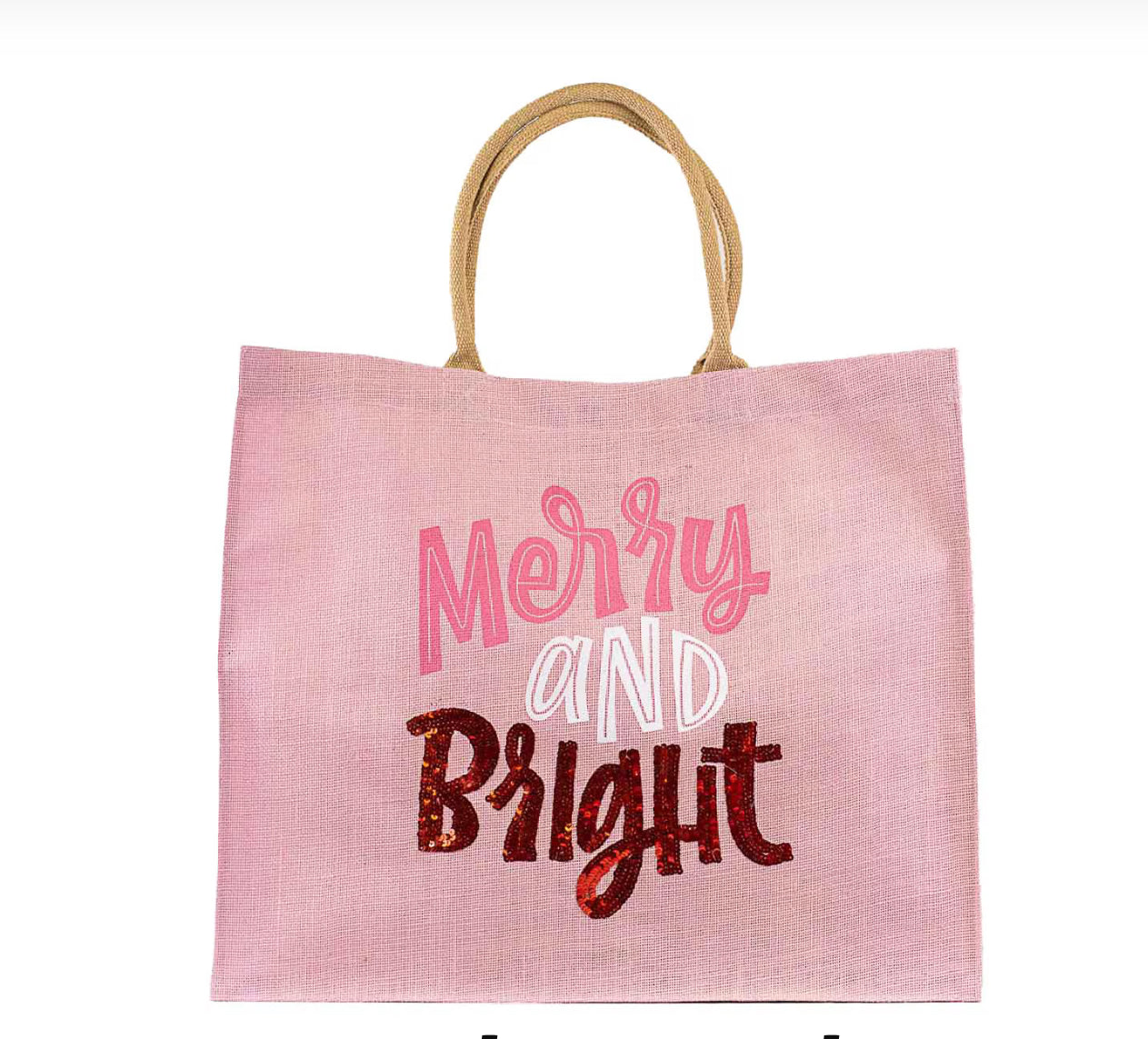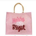 Spread holiday cheer and replace your average gift bag with a reusable gift tote made of woven jute. This oversized tote comes in a light pink, featuring the words "Merry and Bright" the word bright is in a vibrant red sequin that is sure to catch the eye and add some extra flare for this holiday season!
