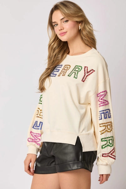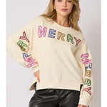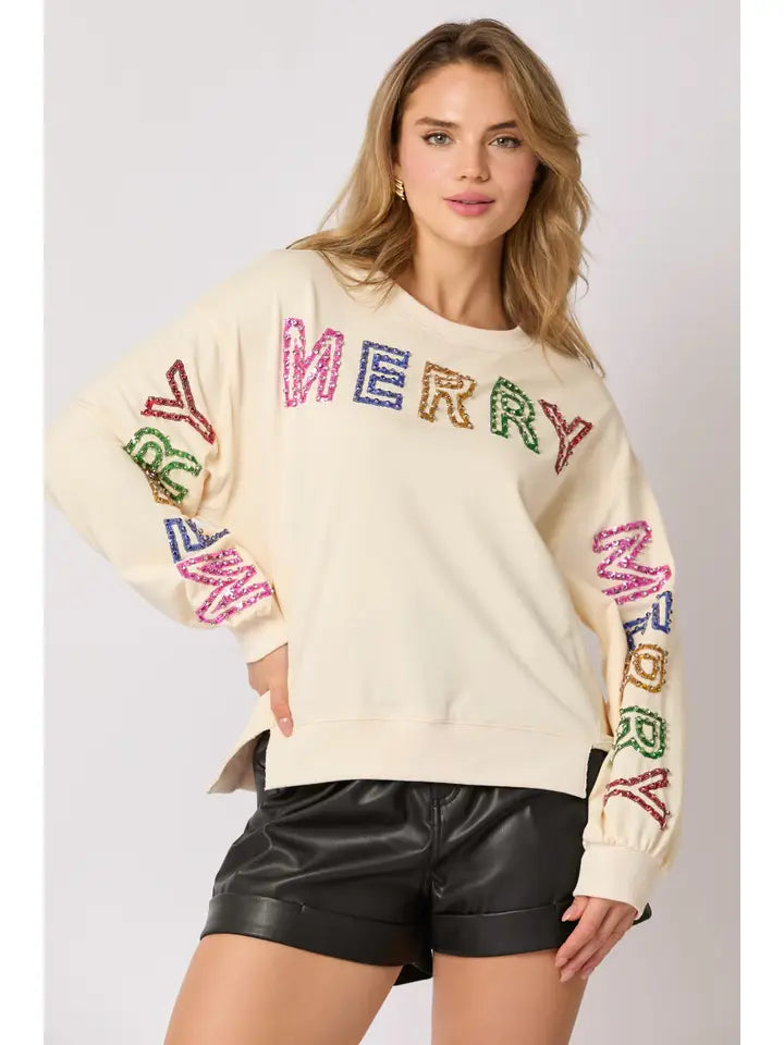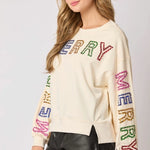 This cream-colored sweater features "Merry" emblazoned across the chest in vibrant rhinestones, adding a joyful touch to your outfit. The sleeves are also adorned with a scatter of colorful rhinestones, giving the entire piece a playful, eye-catching shimmer. The soft cream shade keeps it versatile and easy to pair with anything, while the rhinestone details make it perfect for spreading some holiday cheer or simply brightening up your day. It's the kind of sweater that’s cozy enough for lounging but special enough to make a statement wherever you go.