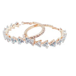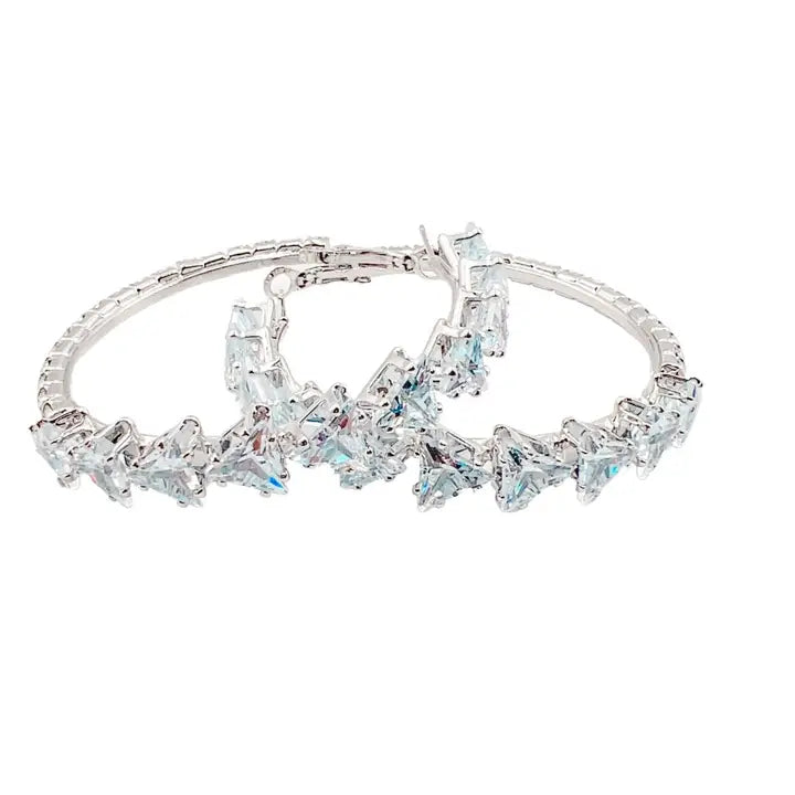 Elevate your accessory game with our striking hoop earrings featuring a unique design. Crafted with precision, these hoops boast triangle gemstones arranged around the circumference leading up to smaller round gemstones for added sparkle and dimension.