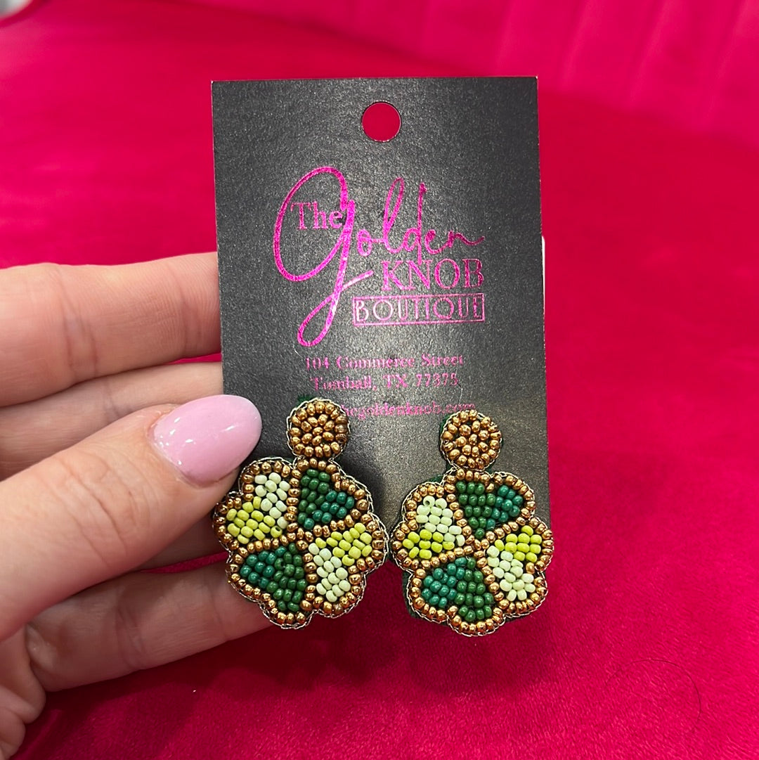 These small clover dangle earrings boast three distinct variations of green beads intricately woven into the clover design. The vibrant greens, complemented by gold beads, create a lively and stylish accessory. The gold bead outline enhances the overall elegance, making them a charming choice for Saint Patrick's Day celebration or any other festive occasion.