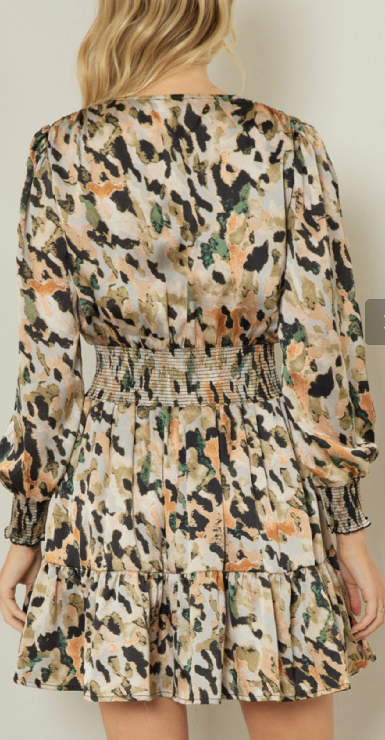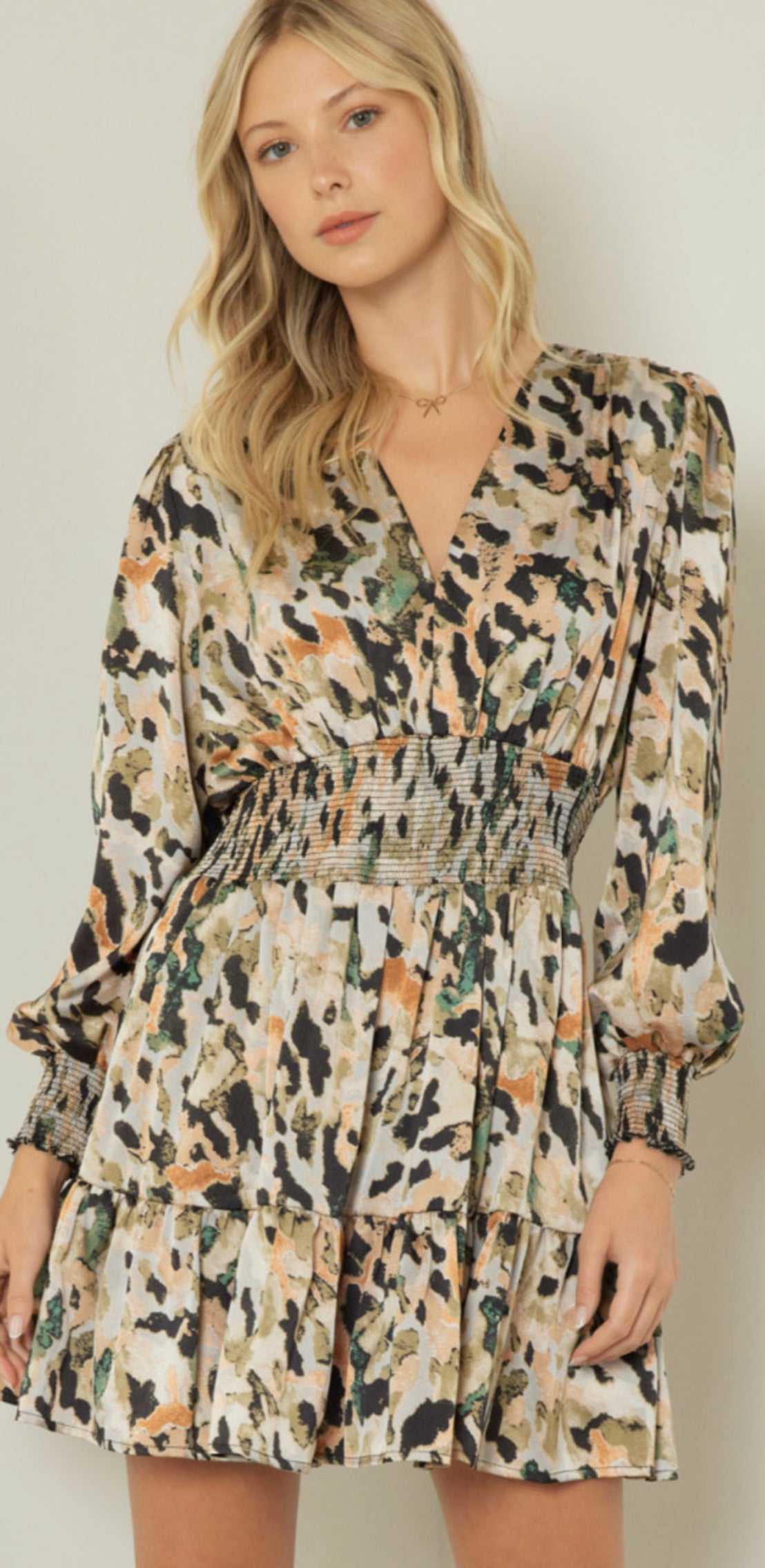 Satin print v-neck long sleeve tiered mini dress featuring smocked waistband and sleeve cuffs. Lined. Woven. Non-sheer. Lightweight.