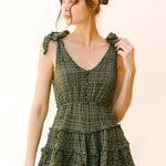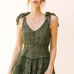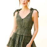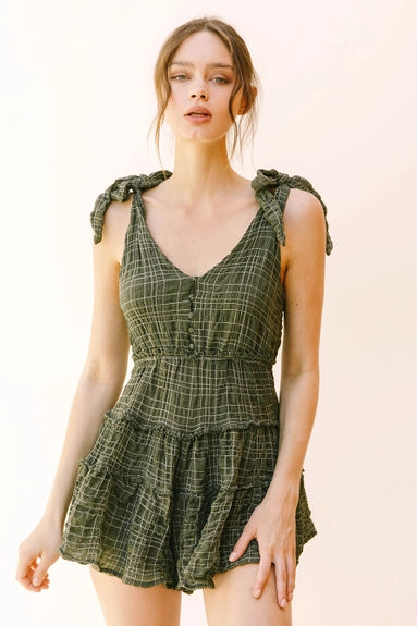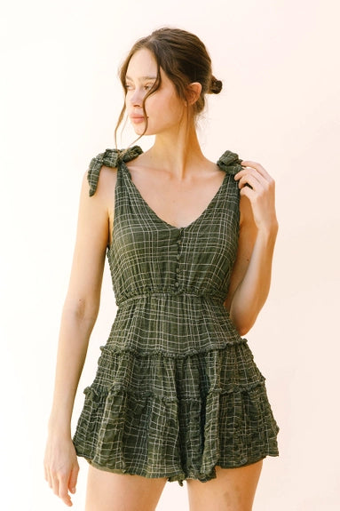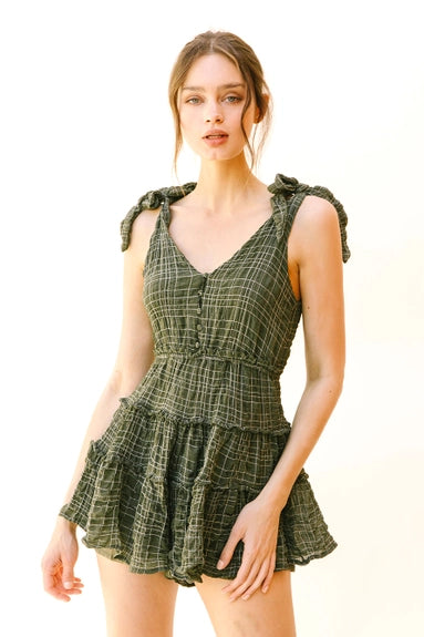 Imagine a chic and stylish monochromatic plaid romper that exudes effortless charm and sophistication. This romper features a classic yet modern design with a front and back V neckline, creating a flattering silhouette that accentuates the shoulders and collarbones. The self-tie straps add a touch of versatility, allowing you to adjust the fit according to your preference while adding a playful and feminine detail to the ensemble. At the upper front, functional buttons add both visual interest and practicality, making it easy to slip in and out of the romper. The standout feature of this romper is its ruffled, wide-leg bottom, which adds a whimsical and romantic flair to the overall look. The ruffles cascade down the legs, creating movement and fluidity with every step, while the wide-leg silhouette offers comfort and freedom of movement.