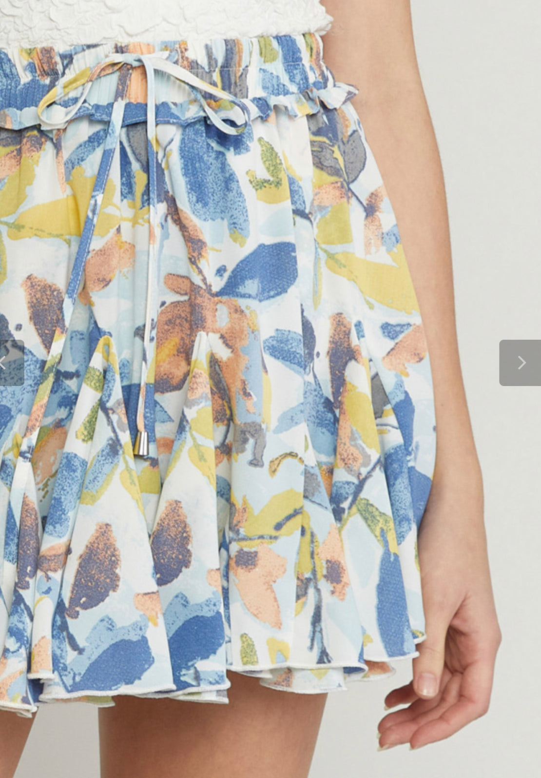 Printed godet skirt featuring drawstring at waist. Lined with shorts. Woven. Non-sheer. Lightweight.