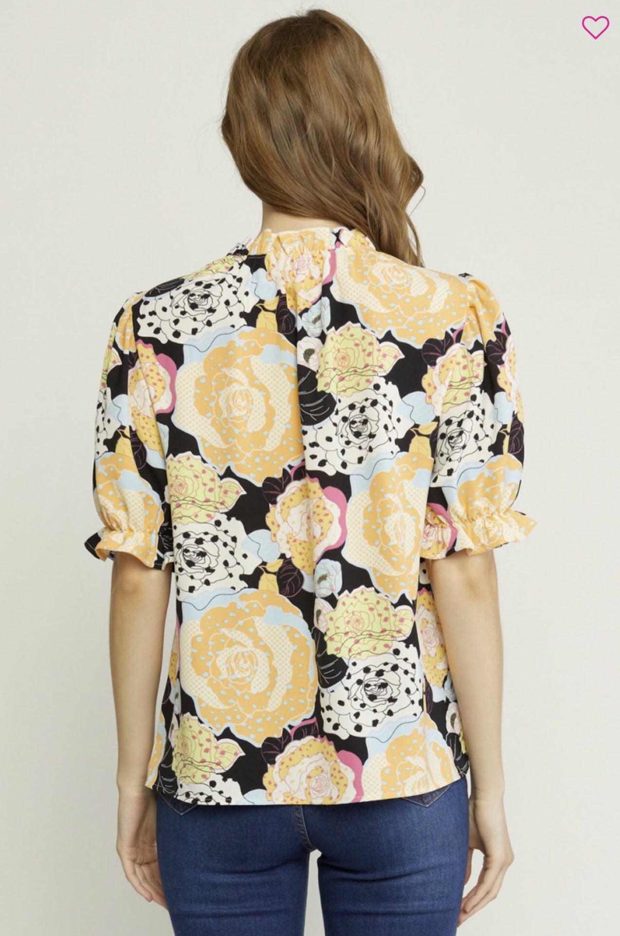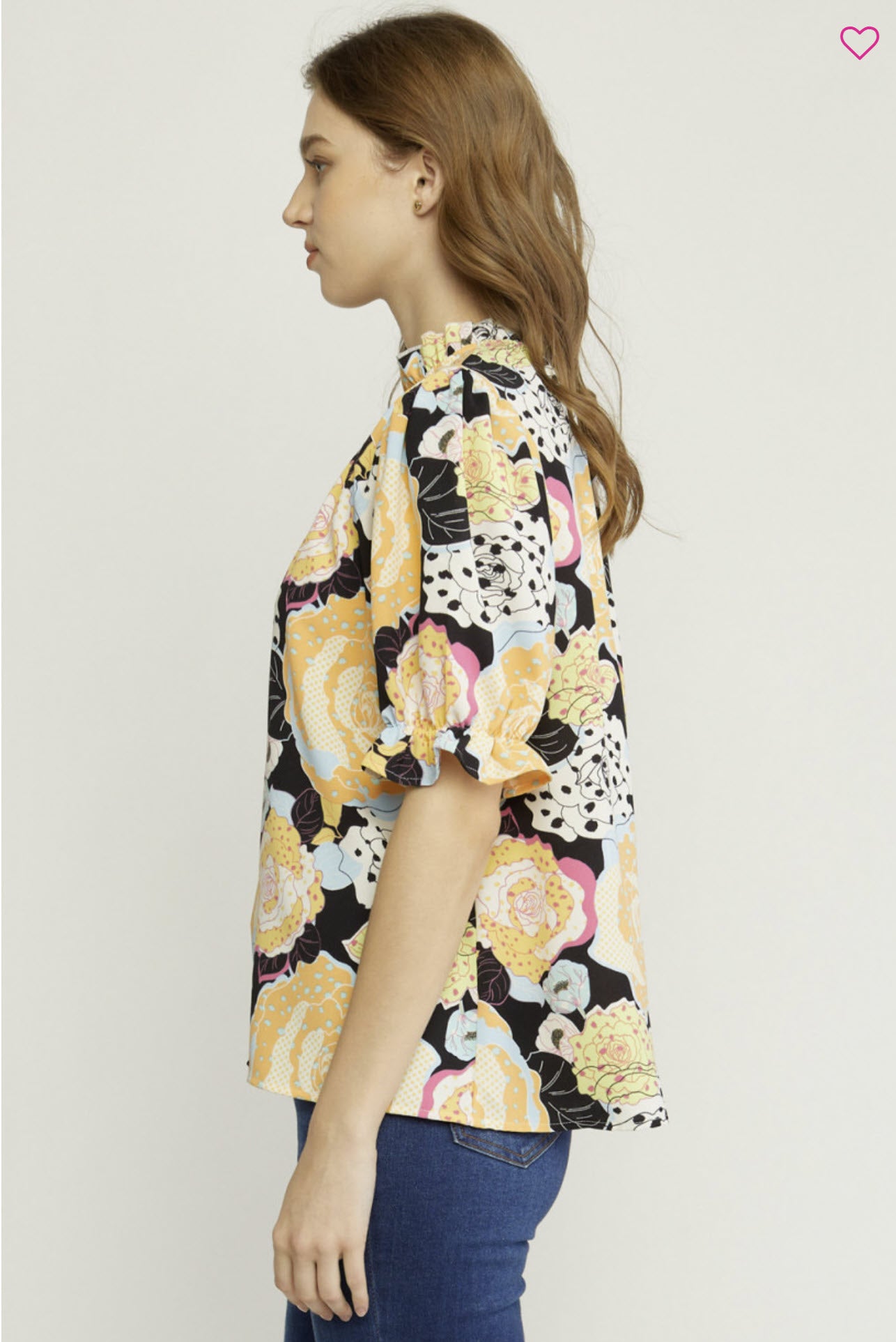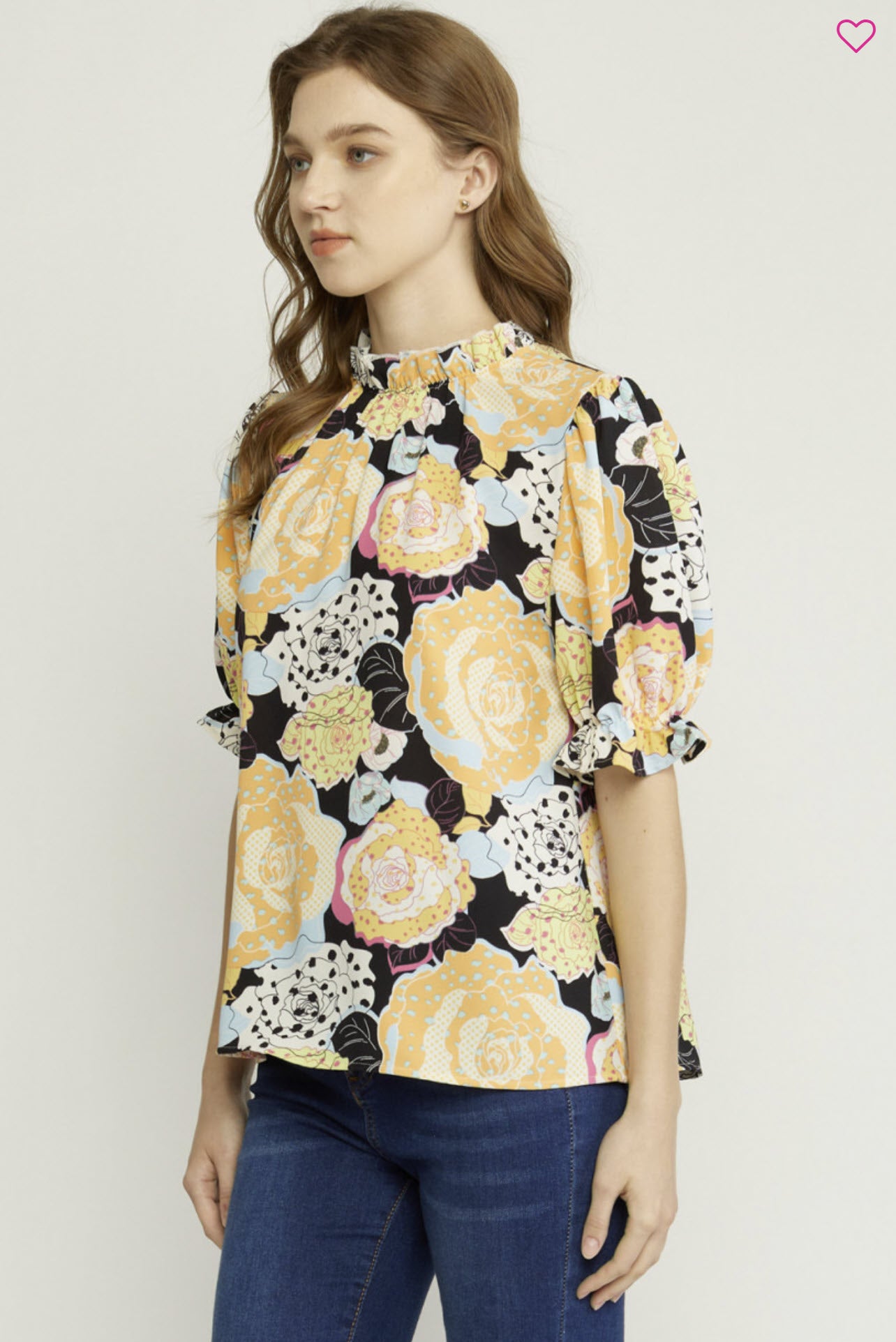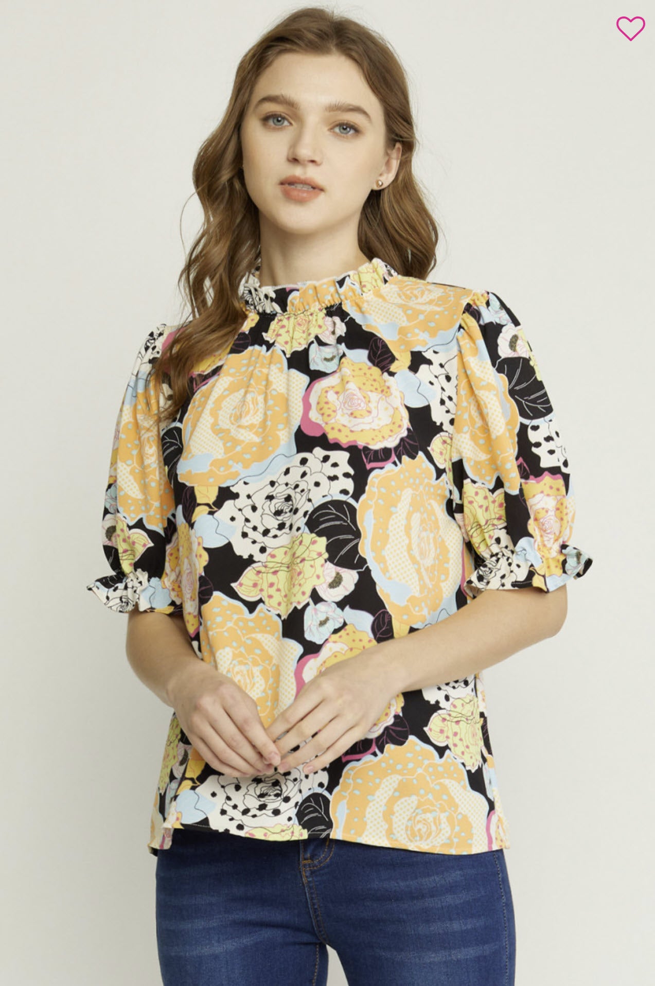 Floral print mock neck half sleeve top featuring ruffle detail at neckline and sleeves. Unlined. Woven. Non-sheer. Lightweight.