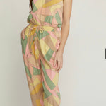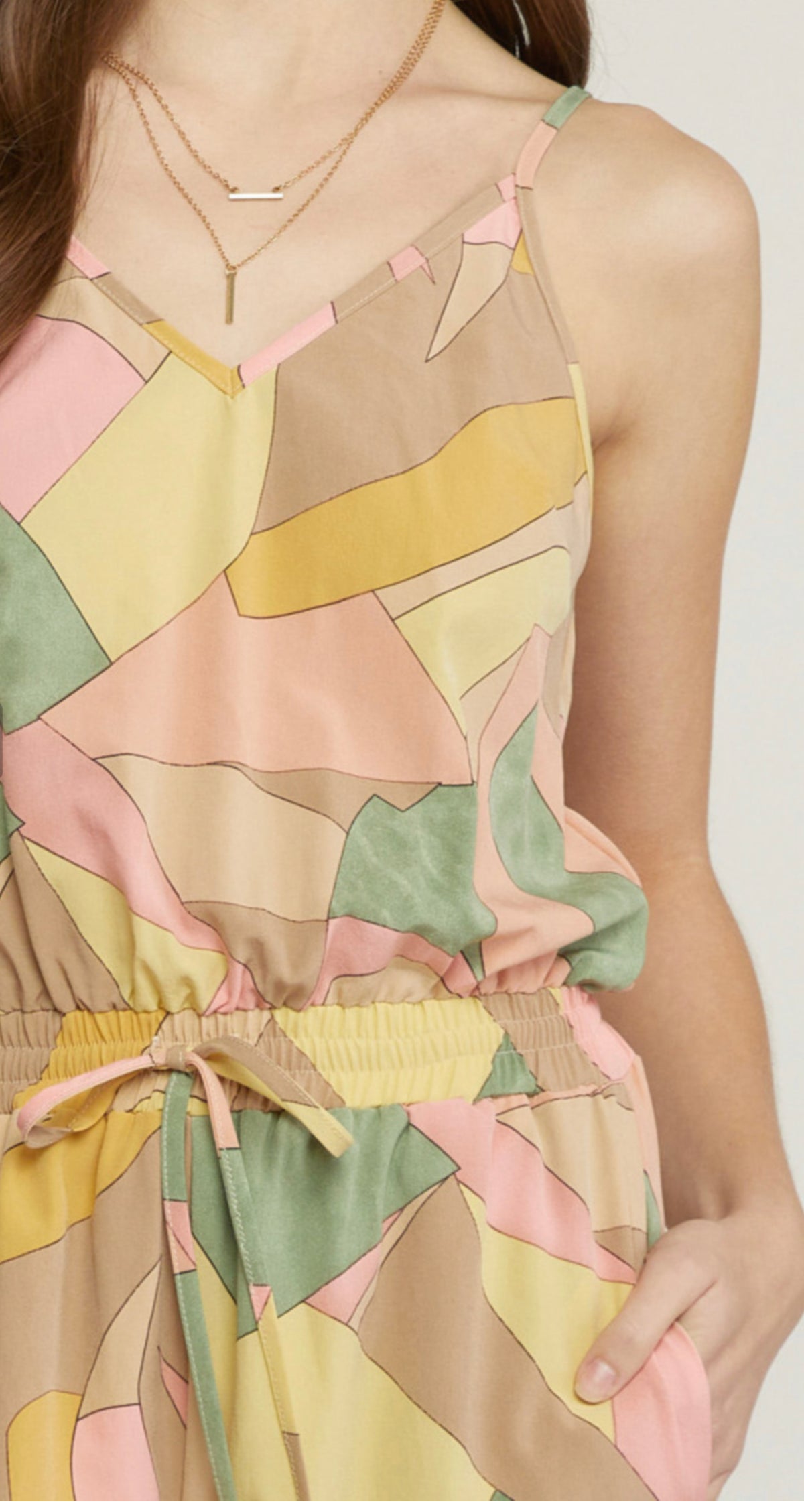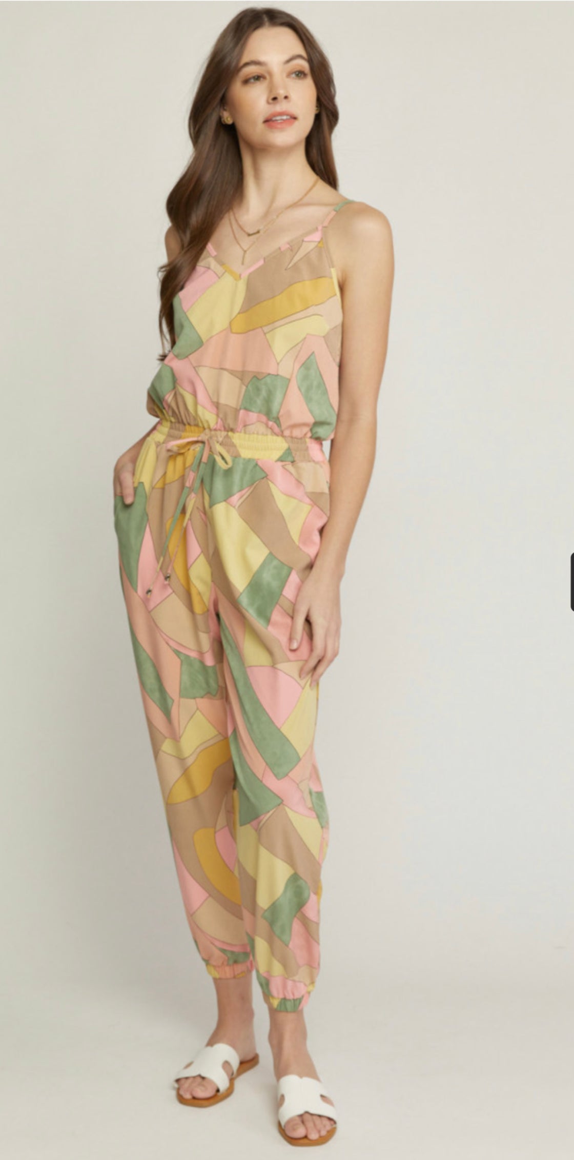 Printed v-neck sleeveless jumpsuit featuring self-tie at waist. Pockets at sides. Elastic at waist and ankles. Adjustable straps. Lined. Woven. Non-sheer. Lightweight.