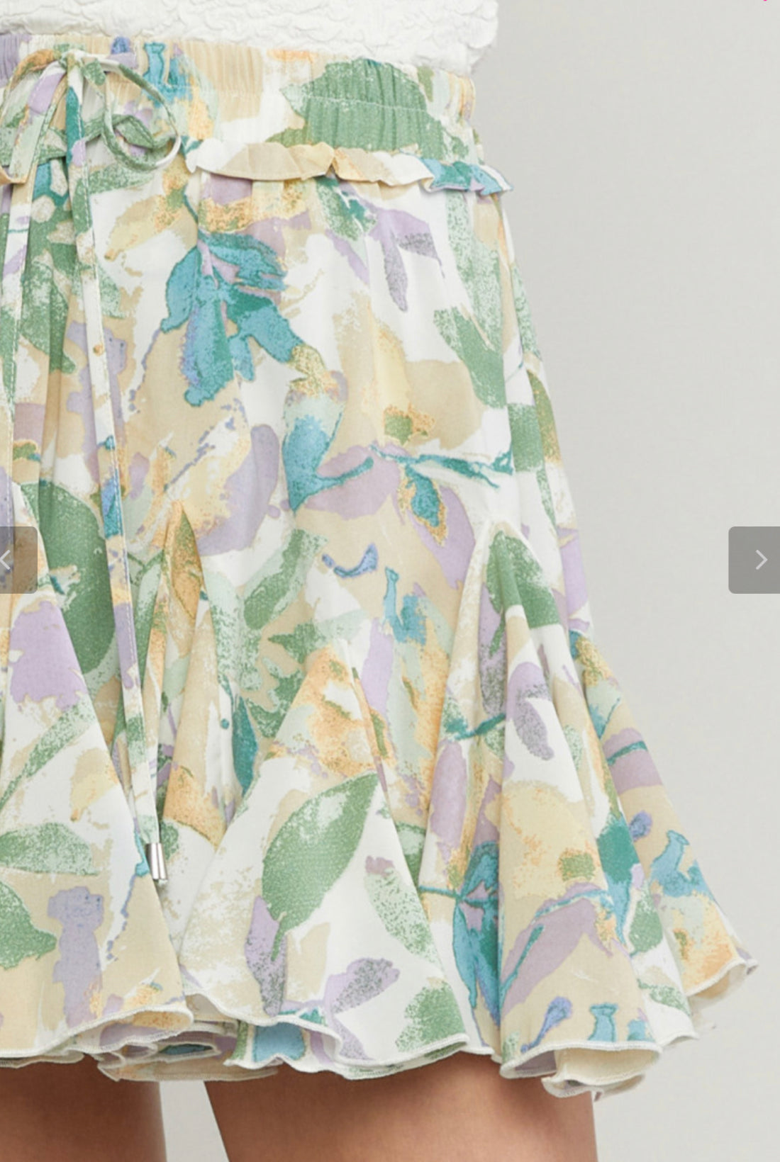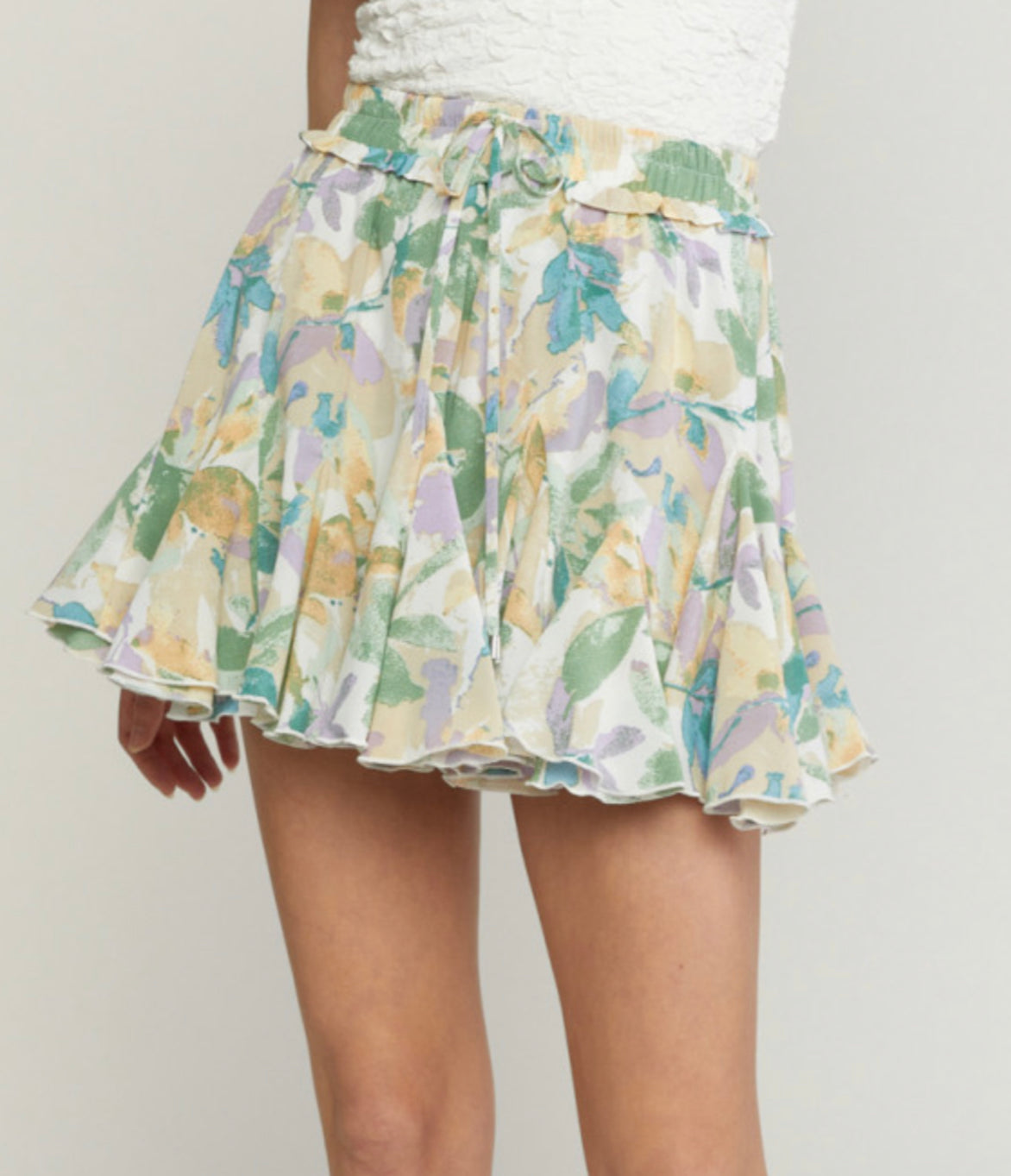 Printed godet skirt featuring drawstring at waist. Lined with shorts. Woven. Non-sheer. Lightweight.