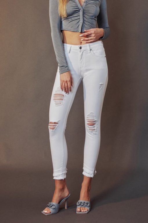 It’s no surprise Nala mid-rise ankle skinny is one of our bestsellers! With tons of distressed details throughout, this pair of denim is the perfect addition to your wardrobe to create a versatile and trendy look for any occasion! Featuring fading, whiskering, contrast stitching, double-layered frayed hem, 5-pockets design, and single button closure with zip fly.