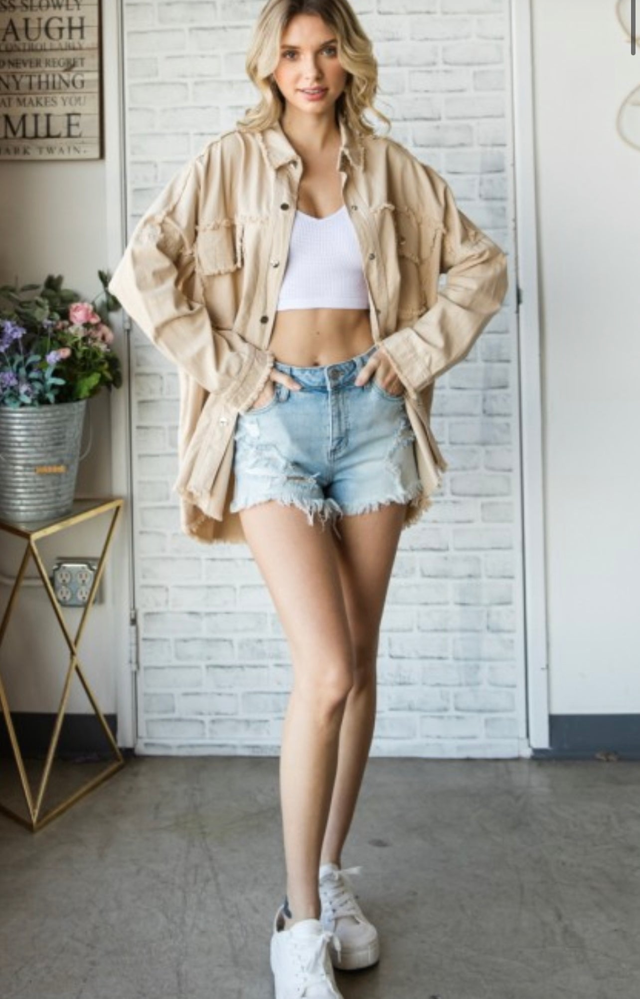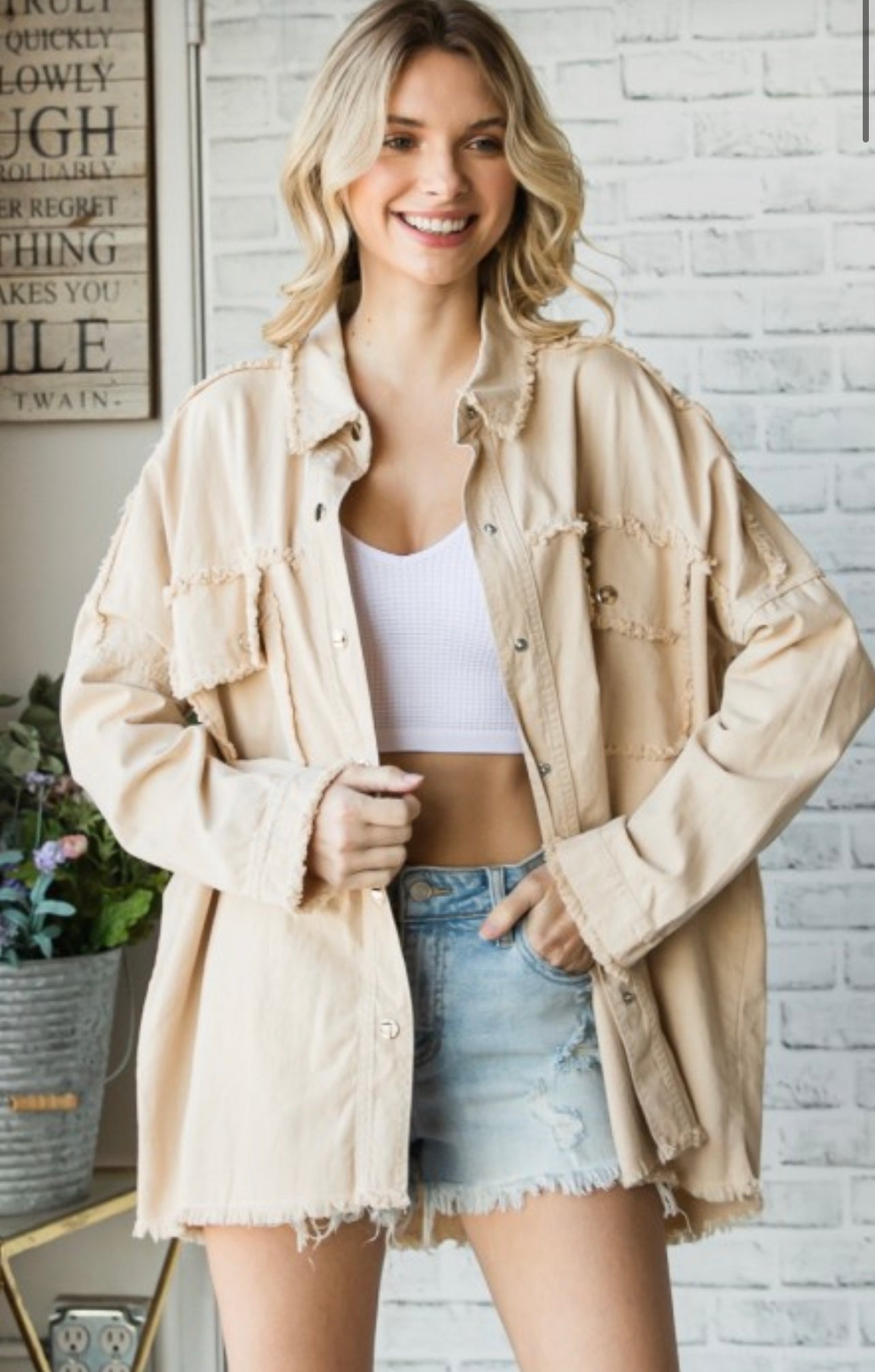 "Rock and Roll" Patch Button Down Raw Hem Longline Twill Jacket