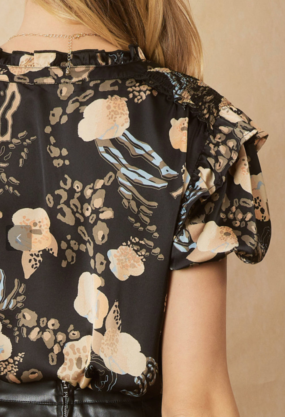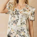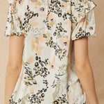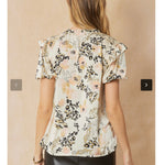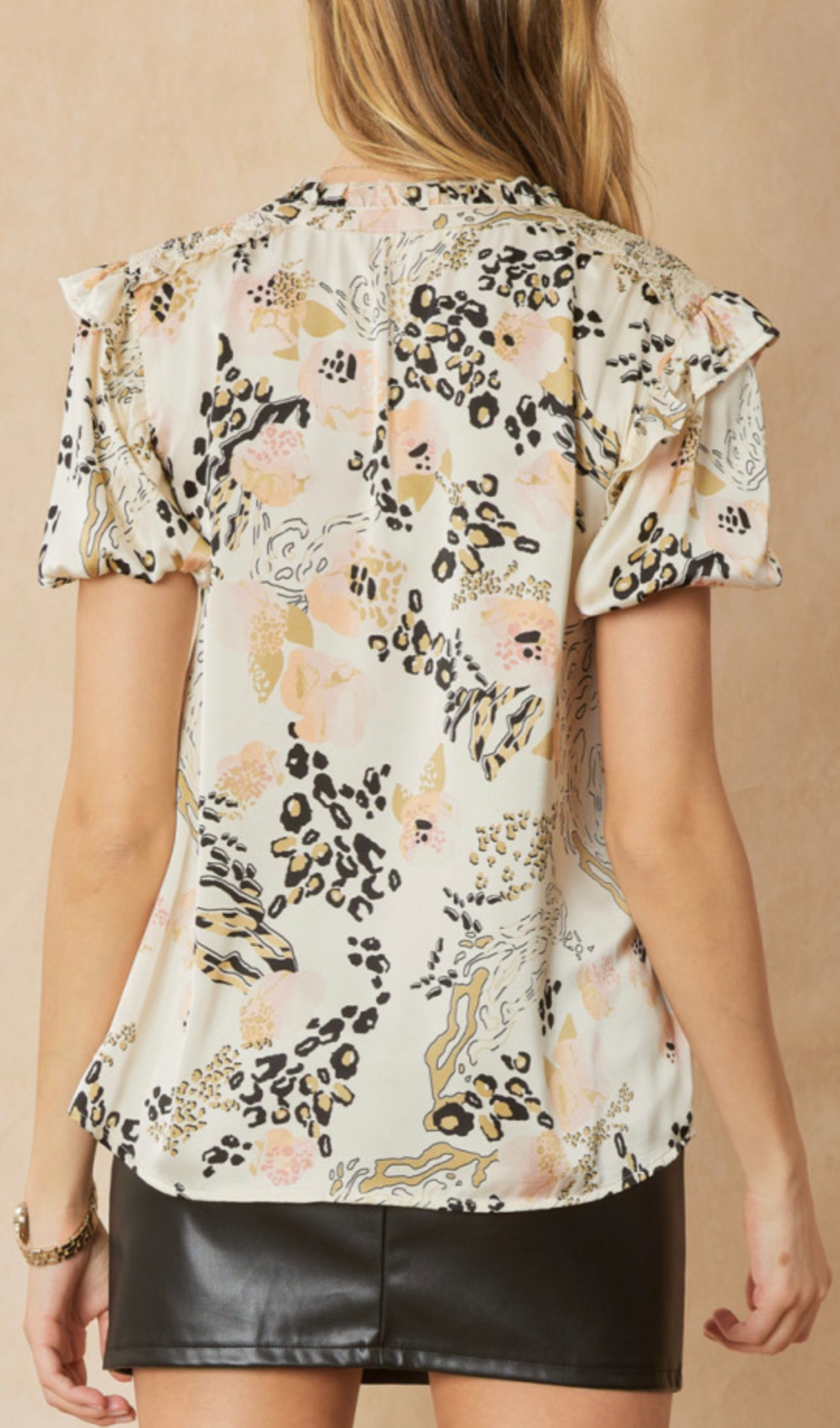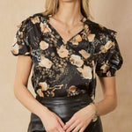 Satin print v-neck puff sleeve top featuring ruffle detail at shoulders. Unlined. Woven. Non-sheer. Lightweight.