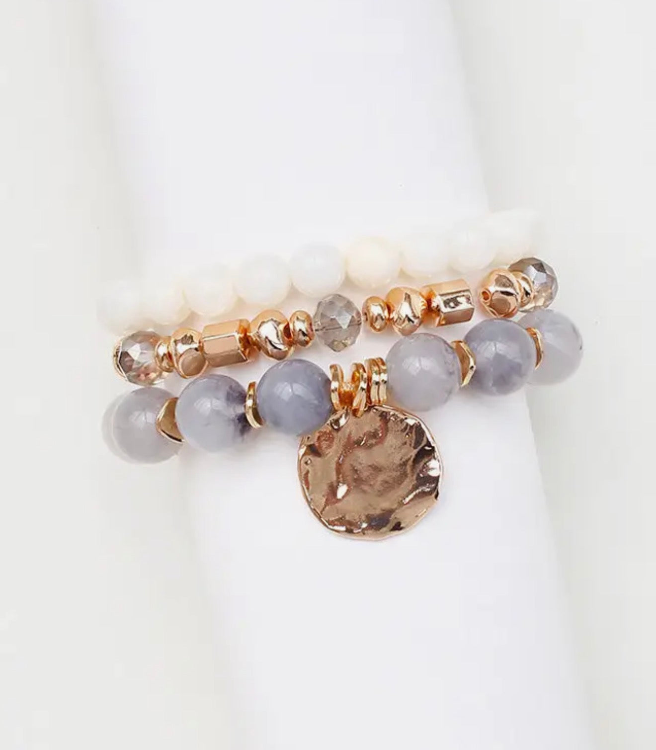 Introducing our Set of 3 White, Grey Natural Stone and Gold with Gold Coin Stretch Bracelets. Each bracelet is beautifully crafted, featuring a unique blend of white, grey, and gold hues complemented by a striking gold coin. Wear them individually or stacked together for a sophisticated touch. Enjoy the blend of fashion and affordability