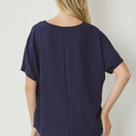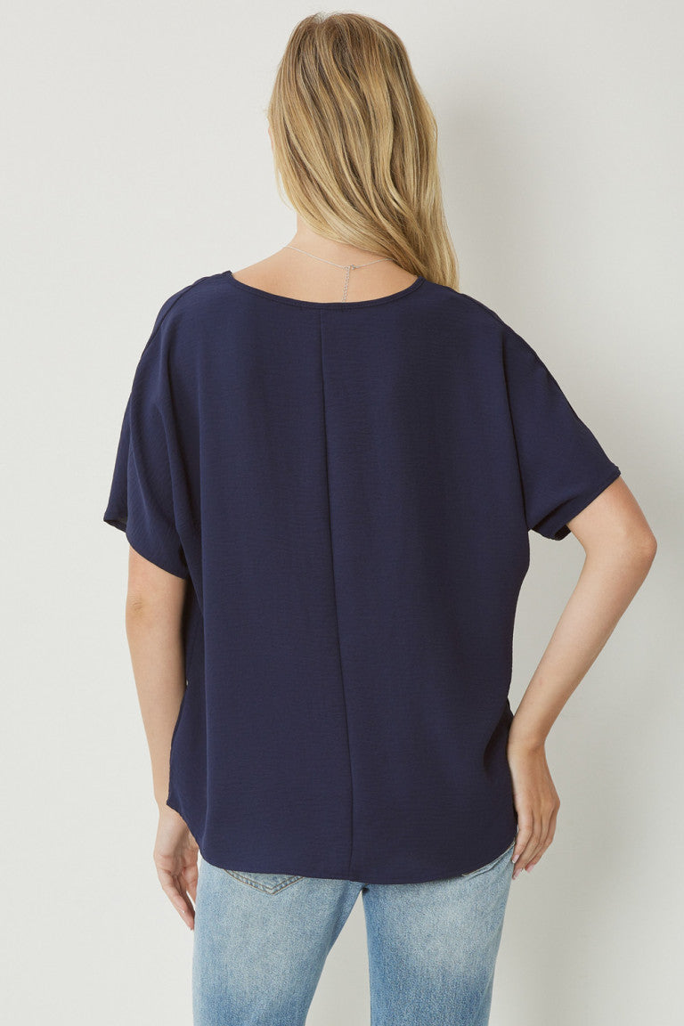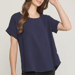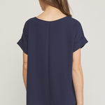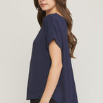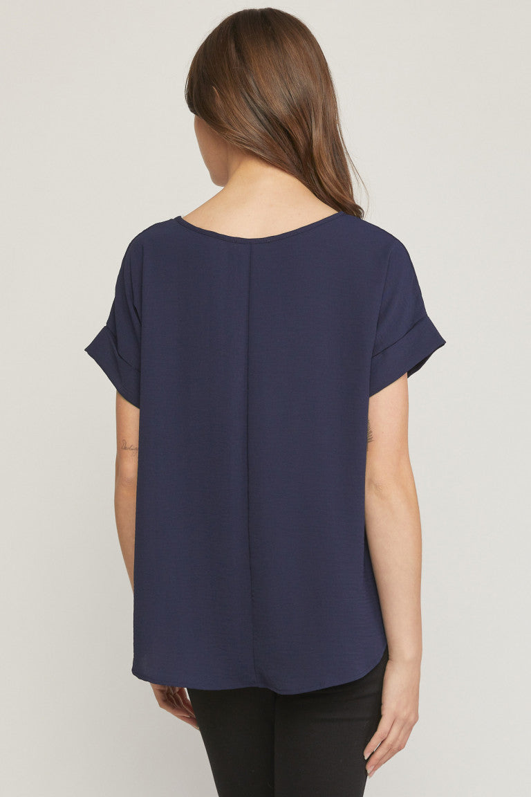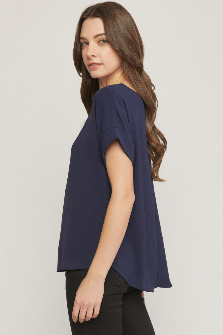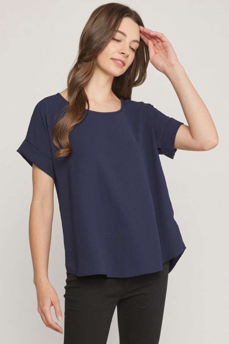 Scoop-neck top featuring permanent rolled sleeve detail. Asymmetrical hem. Non-sheer. Woven. Lightweight. 100%polyester
