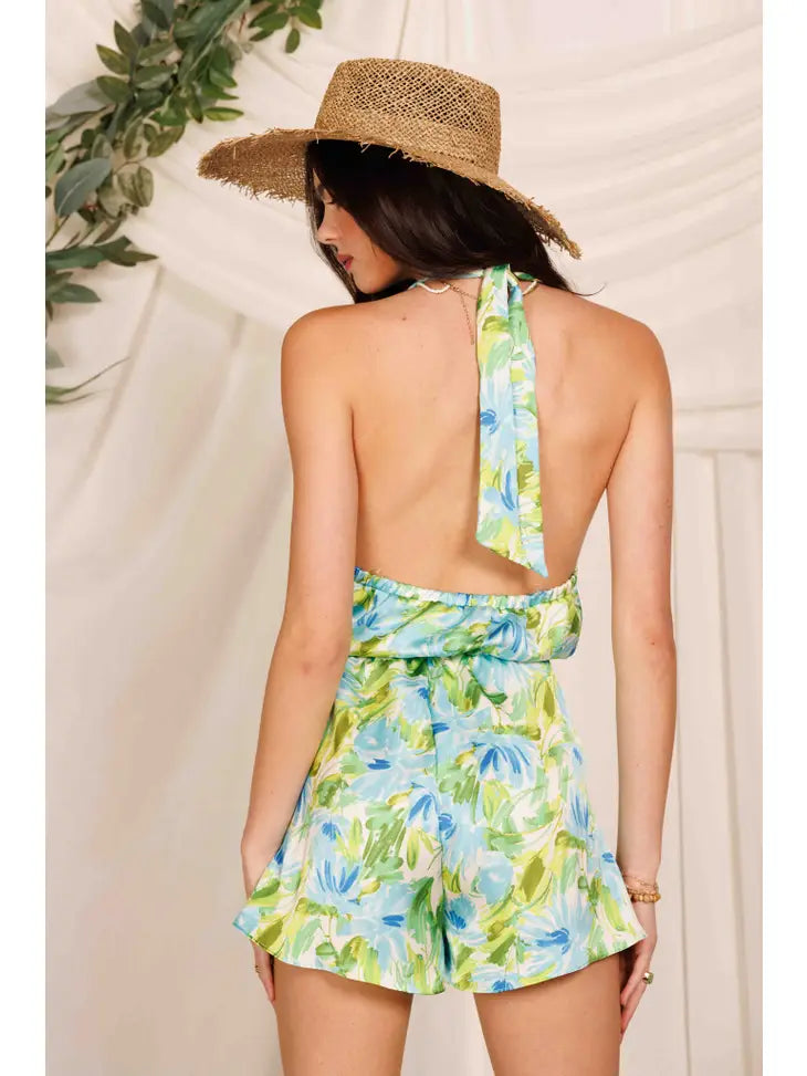 Get ready for summer with this open back cowl neck romper with halter tie back straps. Romper features a cinched elastic waist and roomy wide leg shorts. Complete with a lively tropical print in a pull over fashion.