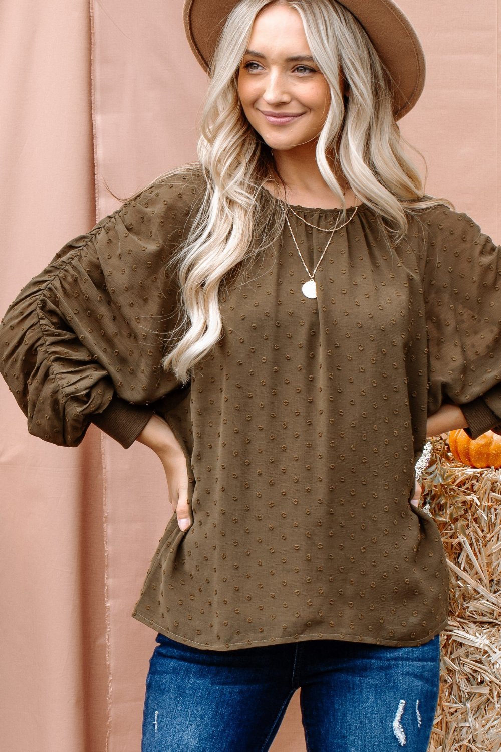 Olive blouse long puffy sleeves with accents