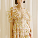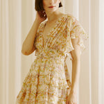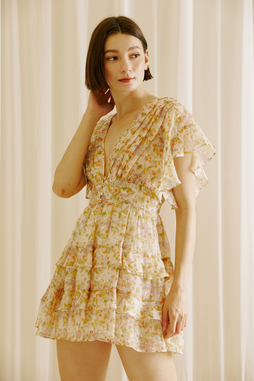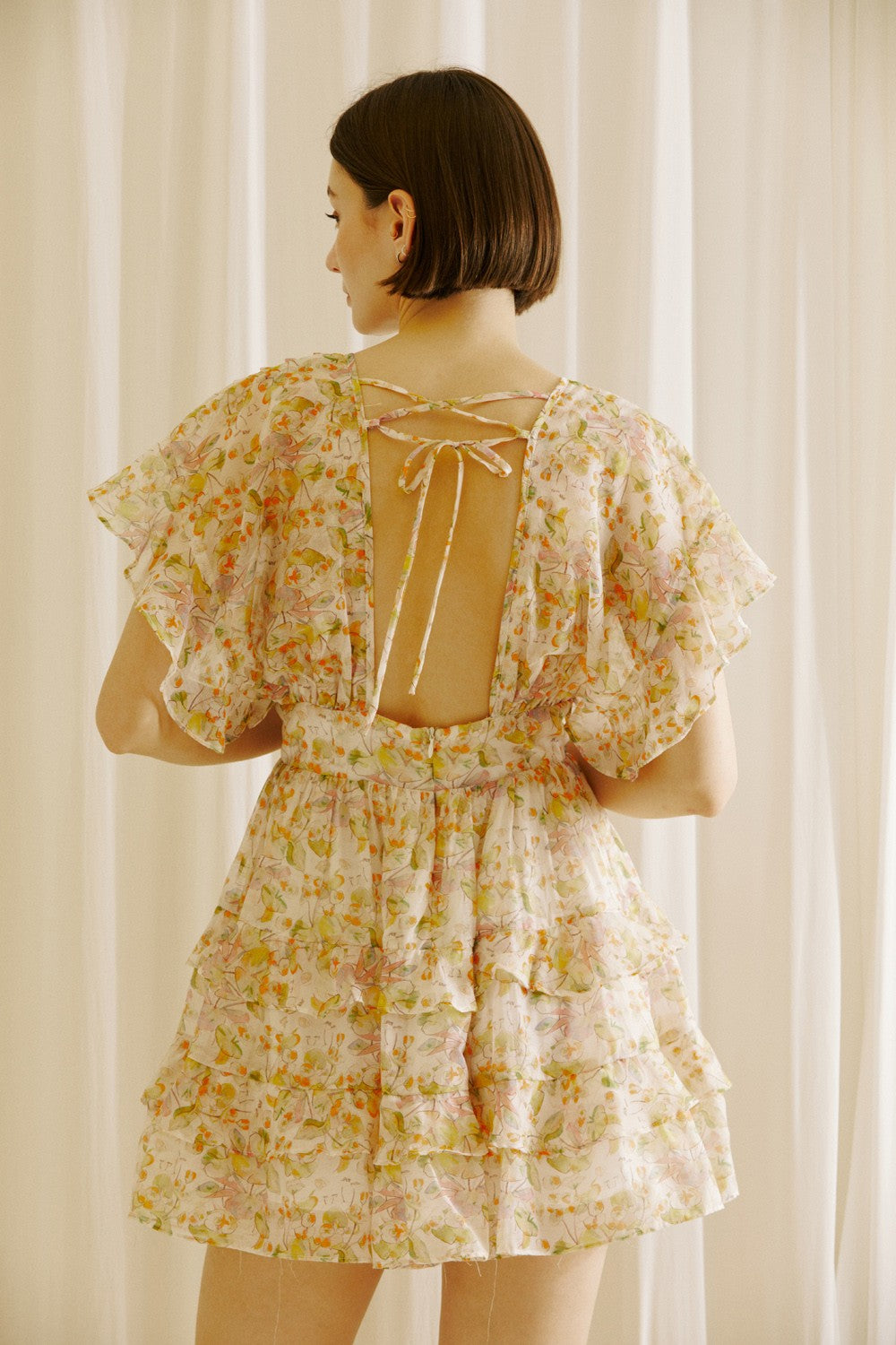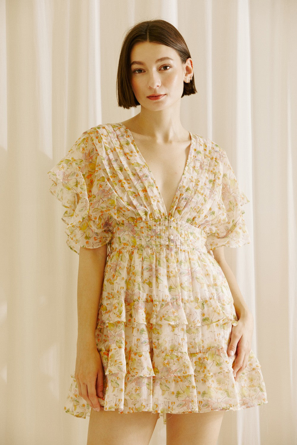 Realistic floral criss-cross open-back mini dress. It features a deep v-neckline, thin pleats along the front, and dolman flowy ruffled sleeves. It also has a (cinched) empire waist with front functional buttons, ruffled A-line bottom, and a back zipper. 100% POLYESTER
