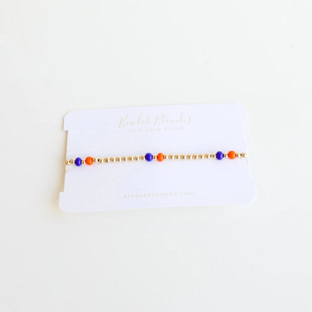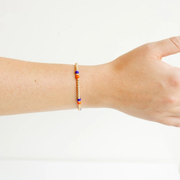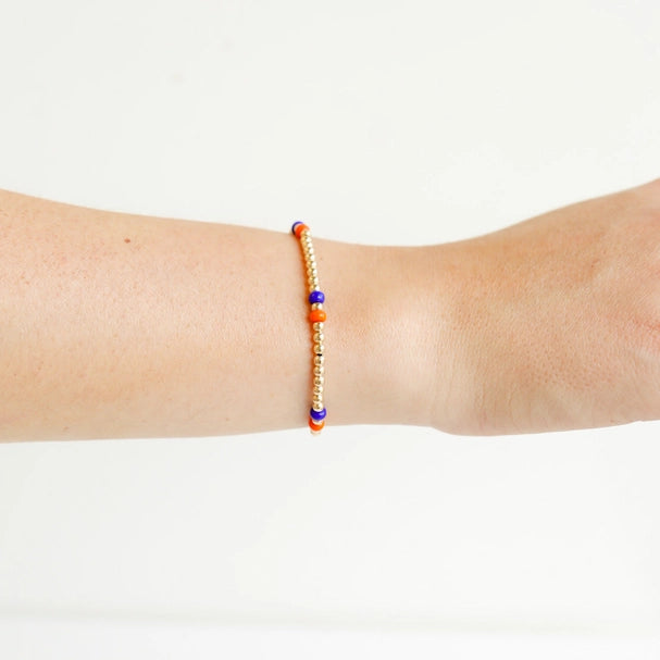 Add a pop of color or show your team spirit with this Orange & Cobalt Blue Game Day Bracelet! This fan-favorite fashion piece is the perfect accessory for any sports game. Go team! Material: 14 K gold filled beads, letter beads, Czech glass beads and durable elastic string. Hand strung with love in College Station, Texas.